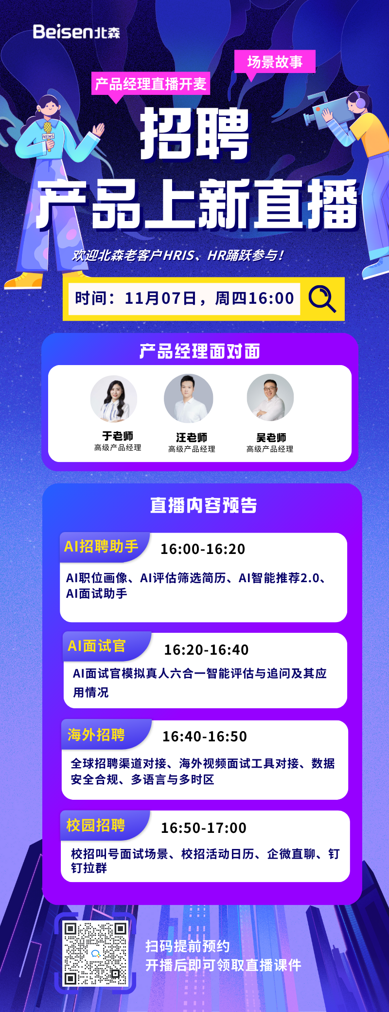 这次,北森招聘产品经理首次直播,和各位HR朋友进行面对面分享交流,分享招聘领域最新的AI技术落地应用,最新的AI产品支撑,最前沿的国际化招聘情况等,仅此一次,不可错过!