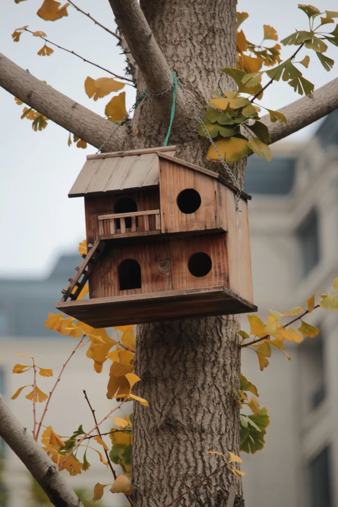 在银杏树的枝头,安放一个个小巧精致的鸟窝,安安静静地栖息在树杈间。或许此刻,小鸟们正依偎在一起,躲避着秋夜的丝丝凉意。