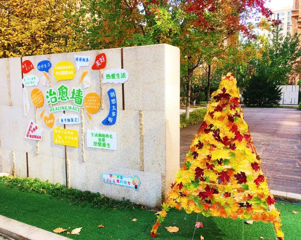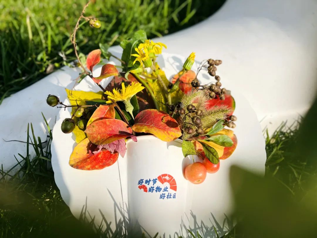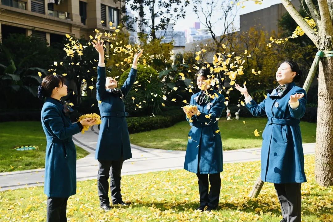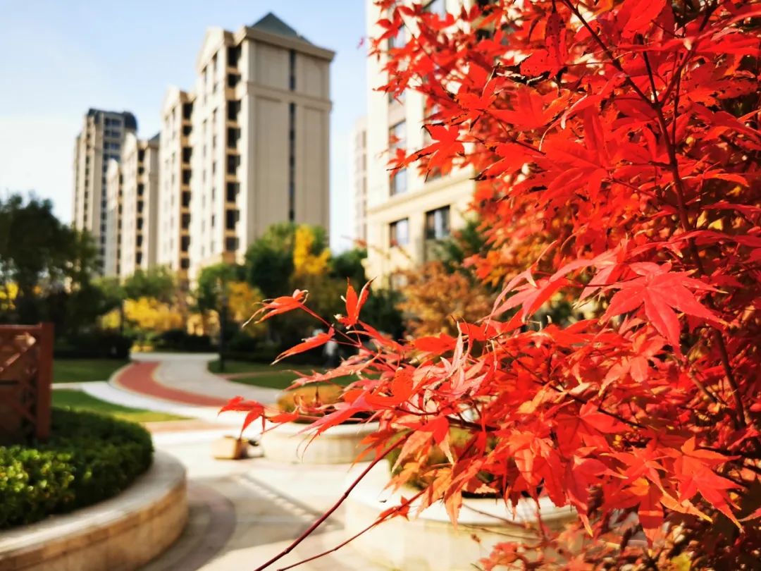 当秋风悄然拂过,枫叶恰似时光的邮票,一枚枚飘落在物业人巧手营造的景观里。
