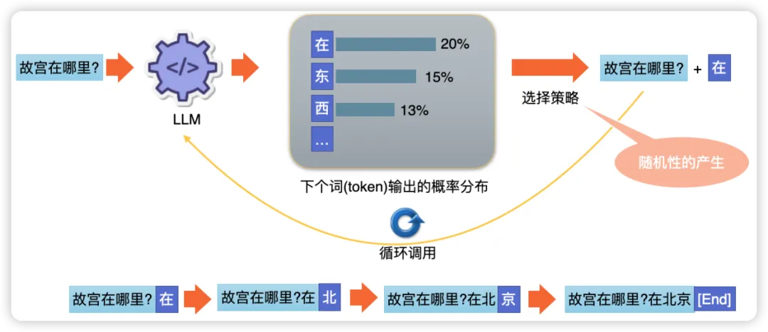 最终,我们可能会得到一个完整的回答:“故宫在哪里?在北京[end]”,这时模型停止生成文本。通过这种方式,大语言模型能够一步步构建出连贯的回答。