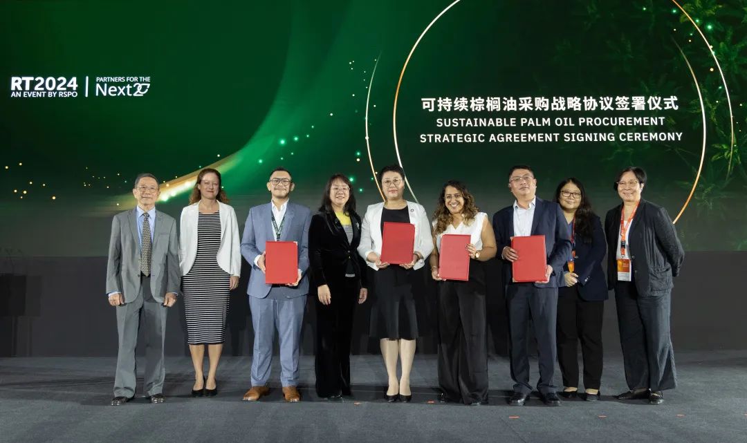 11月11日至13日,可持续棕榈油圆桌倡议(RSPO)2024年度全球圆桌会议(RT2024)在泰国举行。适逢RSPO成立20周年,本次会议主题是“未来20年的合作伙伴:创新促进影响力”。作为大会的重要成果,在中国食品土畜进出口商会(CFNA)、RSPO、世界资源研究所(WRI)、中英合作国际林业投资与贸易项目(InFIT)四大机构的推动和见证下,伊利集团与益海嘉里、邦吉、嘉吉三大国际供应商分别签署了《可持续棕榈油采购战略协议》,承诺将推动以RSPO认证为代表的可持续棕榈油贸易与采购。