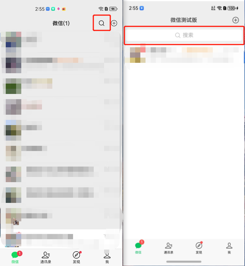 除了功能上的差异,鸿蒙 Next 版微信和正常版微信在布局方面也有所不同,如搜索功能的布局,鸿蒙版的搜索框直接呈现在顶部,方便用户直接使用,而正常版微信则是有一个搜索按钮,需要用户点击后才可以进行搜索操作,这种布局上的变化可能会给用户带来不同的操作体验。