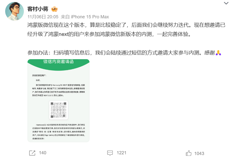 腾讯 WXG(微信事业群)员工@客村小蒋上周在微博宣布,纯血鸿蒙版微信已经趋于稳定。后续团队将继续努力迭代,现在计划邀请已升级 HarmonyOS NEXT 系统的用户参加鸿蒙微信新版本的内测,共同完善体验。