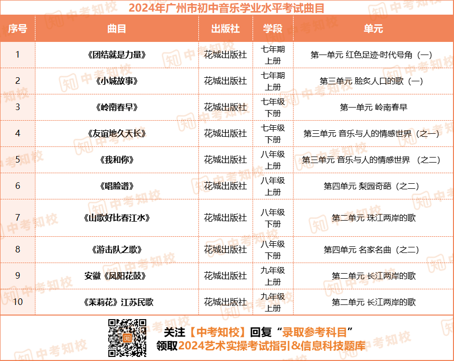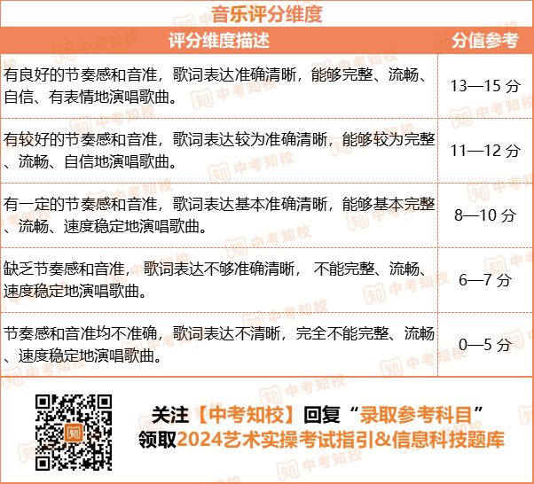 考察内容:从初中《音乐》教科书10首必唱教材歌曲中自选 1 首进行演唱。满分为15分。