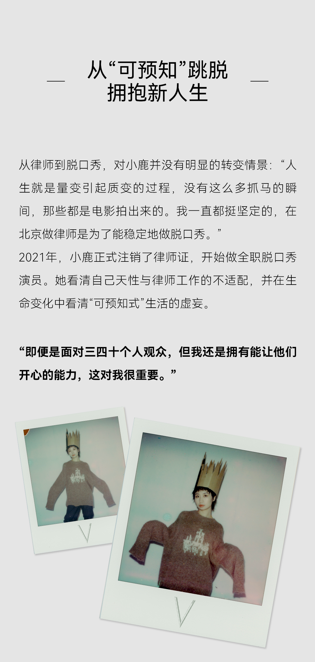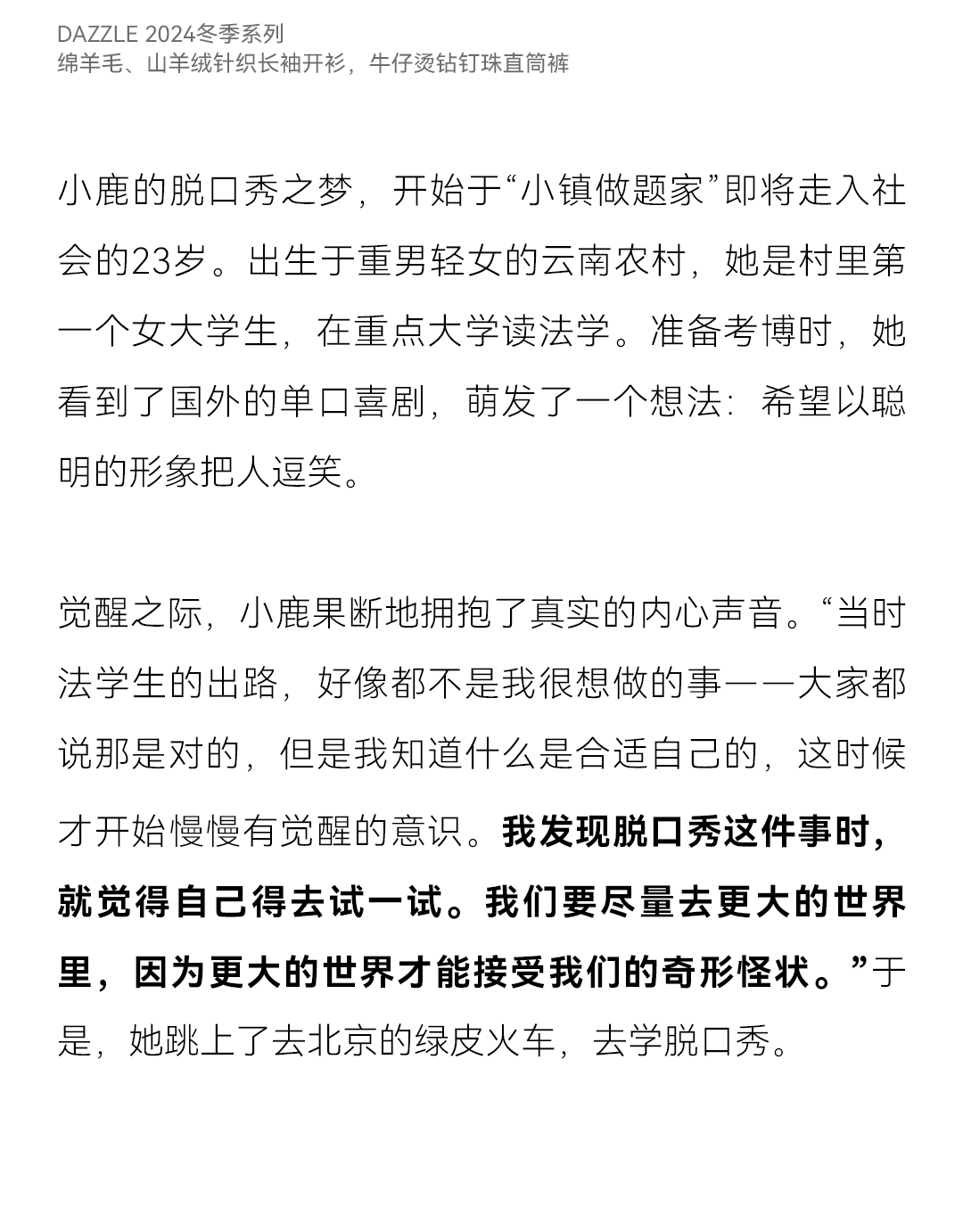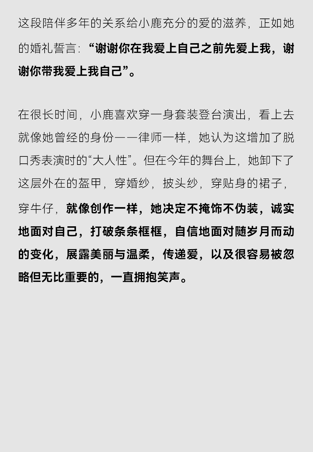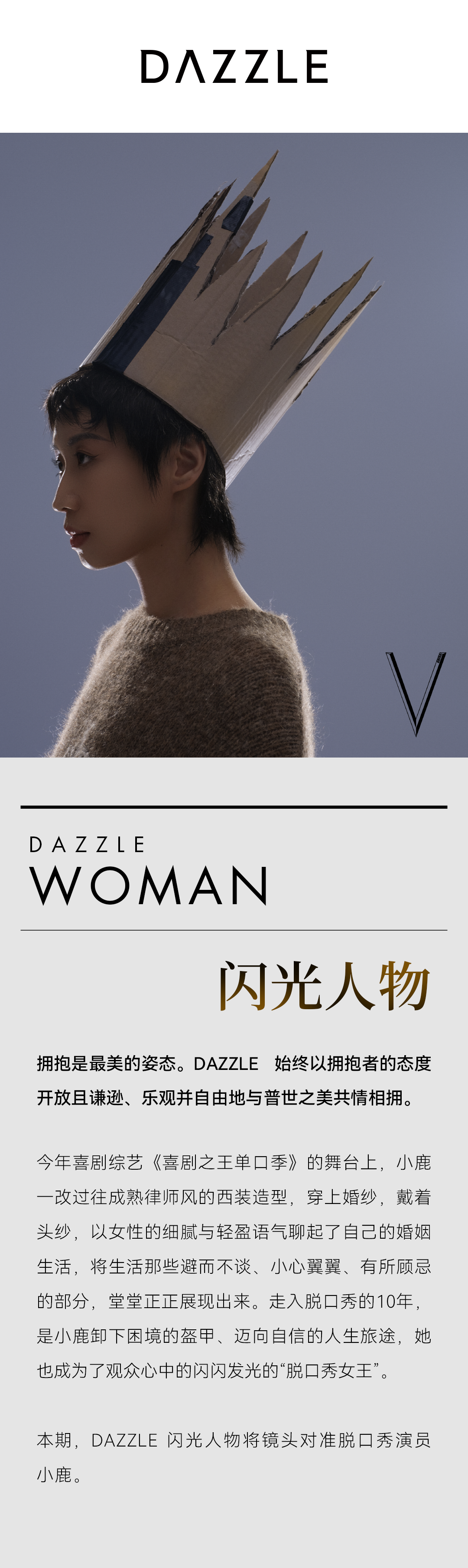 拥抱是最美的姿态。DAZZLE始终以拥抱者的态度开放且谦逊、乐观并自由地与普世之美共情相拥。 今年喜剧综艺《喜剧之王单口季》的舞台上,小鹿一改过往成熟律师风的西装造型,穿上婚纱,戴着头纱,以女性的细腻与轻盈语气聊起了自己的婚姻生活,将生活那些避而不谈、小心翼翼、有所顾忌的部分,堂堂正正展现出来。走入脱口秀的10年,是小鹿卸下困境的盔甲、迈向自信的人生旅途,她也成为了观众心中的闪闪发光的“脱口秀女王”。 本期,DAZZLE闪光人物将镜头对准脱口秀演员小鹿。拥抱真实的内心,将热爱变为新生 从律师到脱口秀演员:“大家都说那是对的,但是我知道什么是适合自己的,这是觉醒的开始。” 小鹿的脱口秀之梦,开始于“小镇做题家”即将走入社会的23岁。出生于重男轻女的云南农村,她是村里第一个女大学生,在重点大学读法学。准备考博时,她看到了国外的单口喜剧,萌发了一个想法:希望以聪明的形象把人逗笑。 觉醒之际,小鹿果断地拥抱了真实的内心声音。“当时法学生的出路,好像都不是我很想做的事——大家都说那是对的,但是我知道什么是合适自己的,这时候才开始慢慢有觉醒的意识。我发现脱口秀这件事时,就觉得自己得去试一试。我们要尽量去更大的世界里,因为更大的世界才能接受我们的奇形怪状。”于是,她跳上了去北京的绿皮火车,去学脱口秀。 她要表达什么? 从2014年开始,小鹿在北京,白天做律师,晚上一路迢迢去城市另一头,风雨无阻地出现在脱口秀开放麦上,这是为了拥抱最直接的反馈——观众真实的笑声,意味着不断创作、测试、验证,直面冷场和质疑,随之而来的再创作,有序地推动边界。有时候一下台,小鹿迫不及待地当场就打开电脑开始修改。 “只要大笑一次,我就像进入生命中的驿站,整个人被放在水里涮了一下,再回来,又有了点儿精神抖擞的样子。”在小鹿看来,笑声特别科学,观众没笑,就说明段子不行。 拥抱内心的创作,不刻意地“搞笑”,没有故作深刻的“说教”,小鹿在舞台上真实、自然、不做作的表达,来自天道酬勤的习惯。学生时代她就有一个蓝色笔记本,上面记满了各种笑话。2014登上脱口秀舞台后,小鹿在电脑上建了一个文件夹,取名叫“你到底要表达什么?”,她开始认真思考自己生活里的真实困扰,那时她写下的第一个段子,是关于女孩子的容貌焦虑。 从“可预知”跳脱,拥抱新人生 从律师到脱口秀,对小鹿并没有明显的转变情景:“人生就是量变引起质变的过程,没有这么多抓马的瞬间,那些都是电影拍出来的。我一直都挺坚定的,在北京做律师是为了能稳定地做脱口秀。” 2021年,小鹿正式注销了律师证,开始做全职脱口秀演员。她看清自己天性与律师工作的不适配,并在生命变化中看清“可预知式”生活的虚妄。 “即便是面对三四十个人观众,但我还是拥有能让他们开心的能力,这对我很重要。” 拥抱真挚的创作,爱现在的自己 “没有一个现成的喜剧世界给女性,而是女性创作者去创造出这个适合女性的世界。“ 喜剧的本质是自嘲和冒犯,而大胆、直率、尖锐则直接打破女性的传统形象。这使得女喜剧演员要面对从内而外的束约和规训,从容貌外形的指摘到大笑的声音难听,苛责无孔不入。 糟糕的境地里拥抱创作,让她将注意力放在如何将困境变成段子上,这让她不再把痛苦看得那么扎实,也不再把快乐看得那么简单:“如果你能坦然地接受自己成功,那你为什么不能坦然地接纳自己的失败?我花了一点时间去接纳自己在有的事情上做得不好。现在,只要在创作上持续精进,我就对自己很满意了。“ 小鹿对谈陈鲁豫中,有一句话简单而动人:“没有一个现成的喜剧世界给女性,而是女性创作者去创造出这个适合女性的世界。”,这足以代表她自己的心声。 创作十年,从女性意识启蒙到中女时代觉醒 2014年至今,小鹿的十年创作,是从见自己到见世界的过程,从第一次专场《小鹿乱撞》讲自己重男轻女的成长,到《真娘儿们》的女性意识启蒙专场,她开始聊挑战传统羞耻感受的女性话题,到《女儿红》专场更进一步,谈起月经羞耻、生育焦虑和女性的人生尴尬,一步步走向了女性生命体验的深处。全球巡回的新专场《我的中女时代》,已是单场超5000人的中大型“演唱会”规模,但依旧场场饱满,一票难求。 一方面,她干劲满满,如她微博所说的:”我知道我能做的,需要做的,就是继续创作出更多好作品。我正在,并且将一直用我的行动去匹配我的‘野心’。”另一方面,小鹿更加松弛了:“我已经过了非黑即白的年纪。我认清了一点,我做的所有事情,都只是为了获得一个愉快的人生。” 蓦然回首,躺在宿舍为迷茫青春痛苦的自己,已经不知不觉来到中女时代,小鹿开玩笑说是骑着独轮车,左手拿着水,右手端果盘,随时会歪倒、战战兢兢的前行状态,但拥抱自己的选择,让她不再焦虑:“年轻的时候什么都没有,现在是我一点点每天努力过来,才成为了现在33岁的我,我比18岁、28岁的我一切都好,所以,我喜欢现在。“ 爱情,是“谢谢你,带我爱上我自己” 小鹿从不避讳分享自己的爱情生活,她与小5岁的澳大利亚老公Thomas,相识相爱、分手复合到结婚携手,笑与泪齐飞的真切感受呈现在脱口秀的舞台上下,在今年的舞台上,小鹿穿着婚纱,以备婚为主题的表演,包袱不断,成为了热门话题。 面对着文化、年龄、性格、性别
