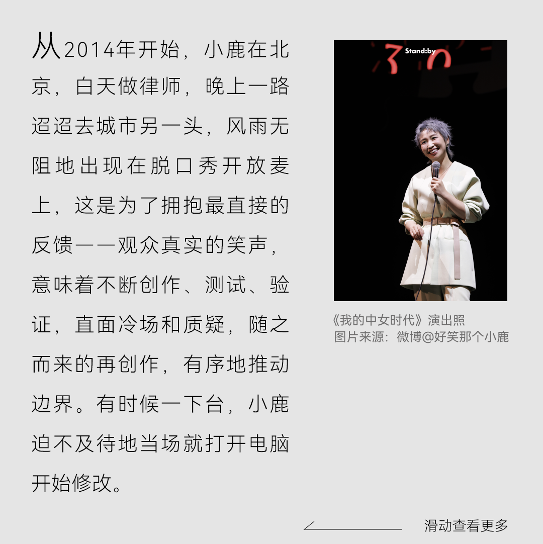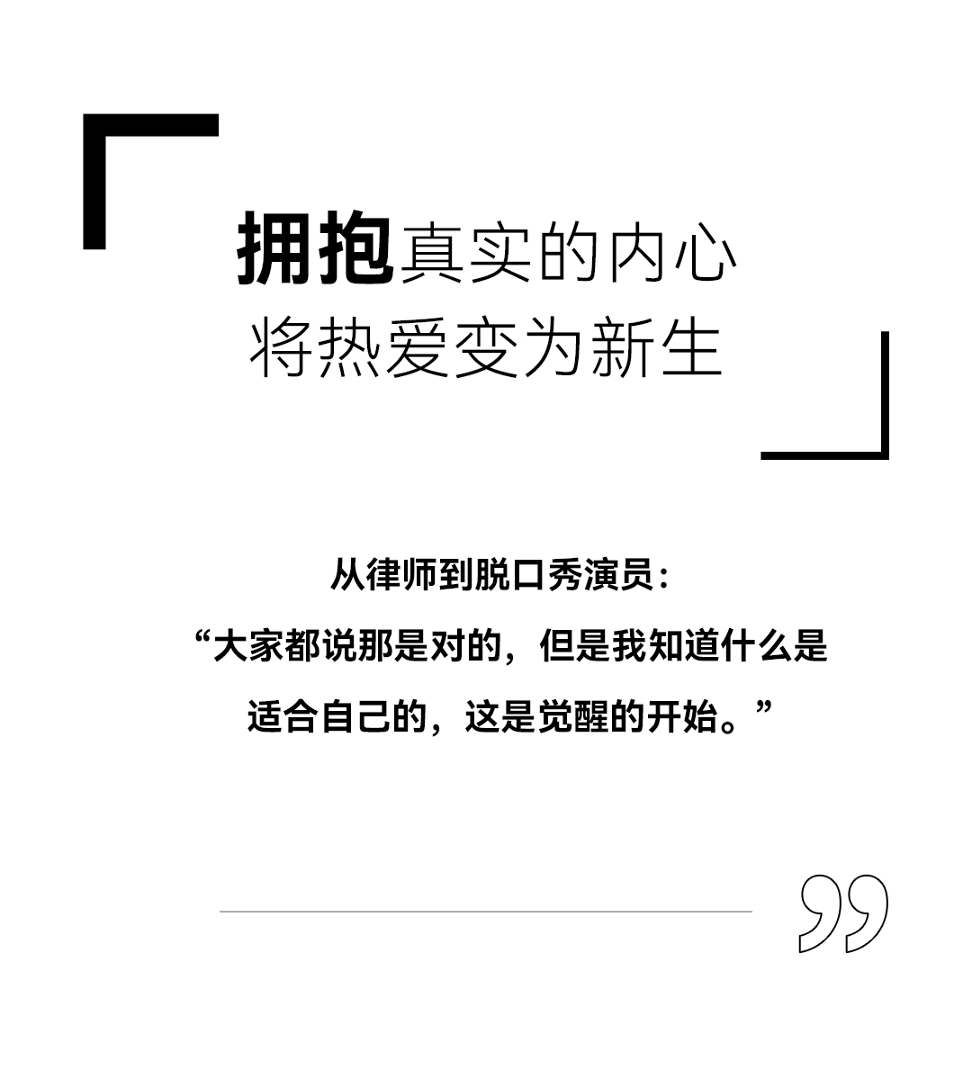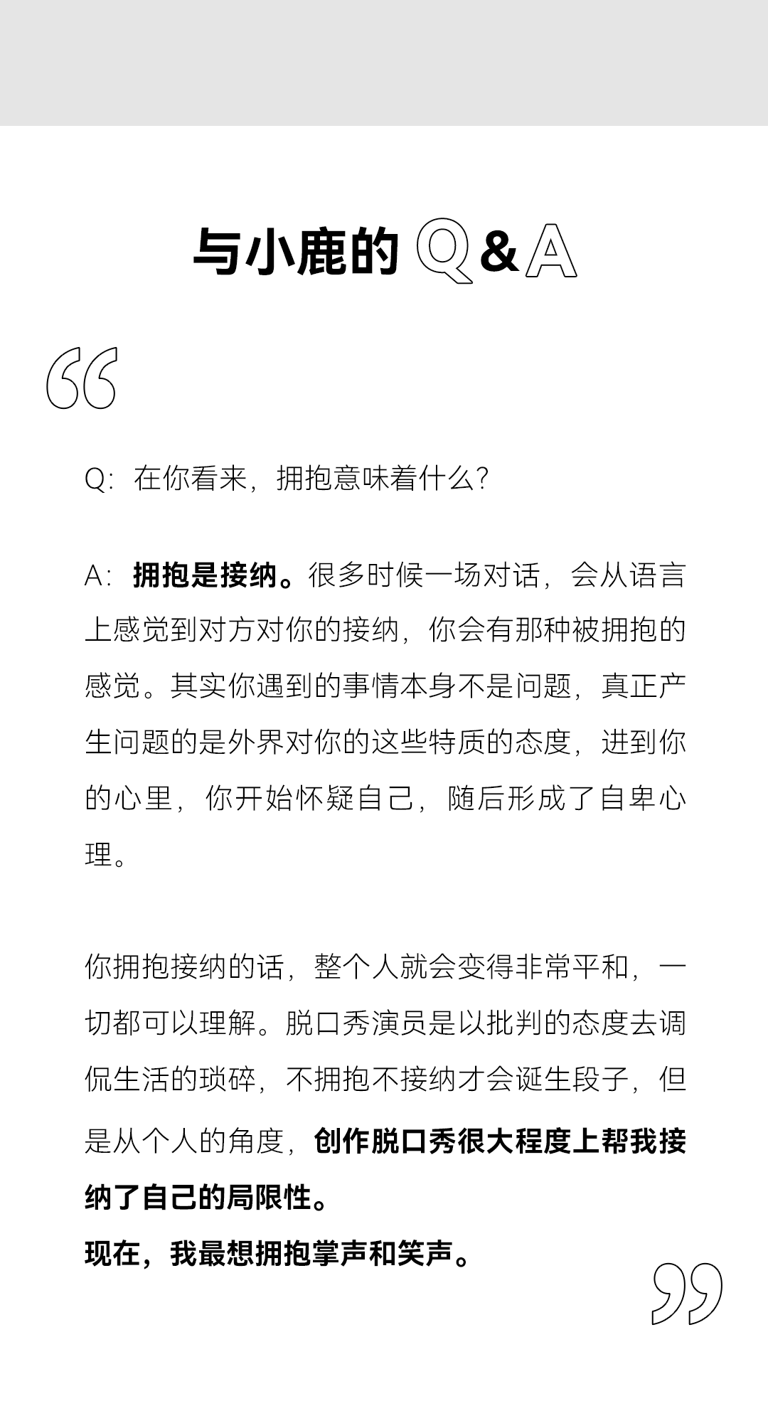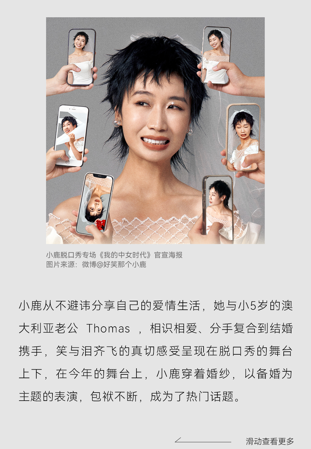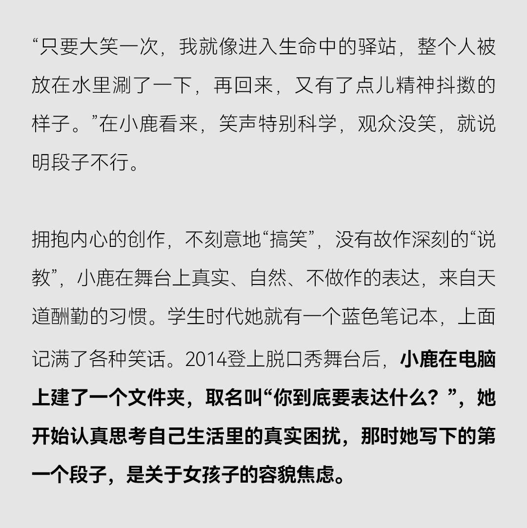 拥抱是最美的姿态。DAZZLE始终以拥抱者的态度开放且谦逊、乐观并自由地与普世之美共情相拥。 今年喜剧综艺《喜剧之王单口季》的舞台上,小鹿一改过往成熟律师风的西装造型,穿上婚纱,戴着头纱,以女性的细腻与轻盈语气聊起了自己的婚姻生活,将生活那些避而不谈、小心翼翼、有所顾忌的部分,堂堂正正展现出来。走入脱口秀的10年,是小鹿卸下困境的盔甲、迈向自信的人生旅途,她也成为了观众心中的闪闪发光的“脱口秀女王”。 本期,DAZZLE闪光人物将镜头对准脱口秀演员小鹿。拥抱真实的内心,将热爱变为新生 从律师到脱口秀演员:“大家都说那是对的,但是我知道什么是适合自己的,这是觉醒的开始。” 小鹿的脱口秀之梦,开始于“小镇做题家”即将走入社会的23岁。出生于重男轻女的云南农村,她是村里第一个女大学生,在重点大学读法学。准备考博时,她看到了国外的单口喜剧,萌发了一个想法:希望以聪明的形象把人逗笑。 觉醒之际,小鹿果断地拥抱了真实的内心声音。“当时法学生的出路,好像都不是我很想做的事——大家都说那是对的,但是我知道什么是合适自己的,这时候才开始慢慢有觉醒的意识。我发现脱口秀这件事时,就觉得自己得去试一试。我们要尽量去更大的世界里,因为更大的世界才能接受我们的奇形怪状。”于是,她跳上了去北京的绿皮火车,去学脱口秀。 她要表达什么? 从2014年开始,小鹿在北京,白天做律师,晚上一路迢迢去城市另一头,风雨无阻地出现在脱口秀开放麦上,这是为了拥抱最直接的反馈——观众真实的笑声,意味着不断创作、测试、验证,直面冷场和质疑,随之而来的再创作,有序地推动边界。有时候一下台,小鹿迫不及待地当场就打开电脑开始修改。 “只要大笑一次,我就像进入生命中的驿站,整个人被放在水里涮了一下,再回来,又有了点儿精神抖擞的样子。”在小鹿看来,笑声特别科学,观众没笑,就说明段子不行。 拥抱内心的创作,不刻意地“搞笑”,没有故作深刻的“说教”,小鹿在舞台上真实、自然、不做作的表达,来自天道酬勤的习惯。学生时代她就有一个蓝色笔记本,上面记满了各种笑话。2014登上脱口秀舞台后,小鹿在电脑上建了一个文件夹,取名叫“你到底要表达什么?”,她开始认真思考自己生活里的真实困扰,那时她写下的第一个段子,是关于女孩子的容貌焦虑。 从“可预知”跳脱,拥抱新人生 从律师到脱口秀,对小鹿并没有明显的转变情景:“人生就是量变引起质变的过程,没有这么多抓马的瞬间,那些都是电影拍出来的。我一直都挺坚定的,在北京做律师是为了能稳定地做脱口秀。” 2021年,小鹿正式注销了律师证,开始做全职脱口秀演员。她看清自己天性与律师工作的不适配,并在生命变化中看清“可预知式”生活的虚妄。 “即便是面对三四十个人观众,但我还是拥有能让他们开心的能力,这对我很重要。” 拥抱真挚的创作,爱现在的自己 “没有一个现成的喜剧世界给女性,而是女性创作者去创造出这个适合女性的世界。“ 喜剧的本质是自嘲和冒犯,而大胆、直率、尖锐则直接打破女性的传统形象。这使得女喜剧演员要面对从内而外的束约和规训,从容貌外形的指摘到大笑的声音难听,苛责无孔不入。 糟糕的境地里拥抱创作,让她将注意力放在如何将困境变成段子上,这让她不再把痛苦看得那么扎实,也不再把快乐看得那么简单:“如果你能坦然地接受自己成功,那你为什么不能坦然地接纳自己的失败?我花了一点时间去接纳自己在有的事情上做得不好。现在,只要在创作上持续精进,我就对自己很满意了。“ 小鹿对谈陈鲁豫中,有一句话简单而动人:“没有一个现成的喜剧世界给女性,而是女性创作者去创造出这个适合女性的世界。”,这足以代表她自己的心声。 创作十年,从女性意识启蒙到中女时代觉醒 2014年至今,小鹿的十年创作,是从见自己到见世界的过程,从第一次专场《小鹿乱撞》讲自己重男轻女的成长,到《真娘儿们》的女性意识启蒙专场,她开始聊挑战传统羞耻感受的女性话题,到《女儿红》专场更进一步,谈起月经羞耻、生育焦虑和女性的人生尴尬,一步步走向了女性生命体验的深处。全球巡回的新专场《我的中女时代》,已是单场超5000人的中大型“演唱会”规模,但依旧场场饱满,一票难求。 一方面,她干劲满满,如她微博所说的:”我知道我能做的,需要做的,就是继续创作出更多好作品。我正在,并且将一直用我的行动去匹配我的‘野心’。”另一方面,小鹿更加松弛了:“我已经过了非黑即白的年纪。我认清了一点,我做的所有事情,都只是为了获得一个愉快的人生。” 蓦然回首,躺在宿舍为迷茫青春痛苦的自己,已经不知不觉来到中女时代,小鹿开玩笑说是骑着独轮车,左手拿着水,右手端果盘,随时会歪倒、战战兢兢的前行状态,但拥抱自己的选择,让她不再焦虑:“年轻的时候什么都没有,现在是我一点点每天努力过来,才成为了现在33岁的我,我比18岁、28岁的我一切都好,所以,我喜欢现在。“ 爱情,是“谢谢你,带我爱上我自己” 小鹿从不避讳分享自己的爱情生活,她与小5岁的澳大利亚老公Thomas,相识相爱、分手复合到结婚携手,笑与泪齐飞的真切感受呈现在脱口秀的舞台上下,在今年的舞台上,小鹿穿着婚纱,以备婚为主题的表演,包袱不断,成为了热门话题。 面对着文化、年龄、性格、性别