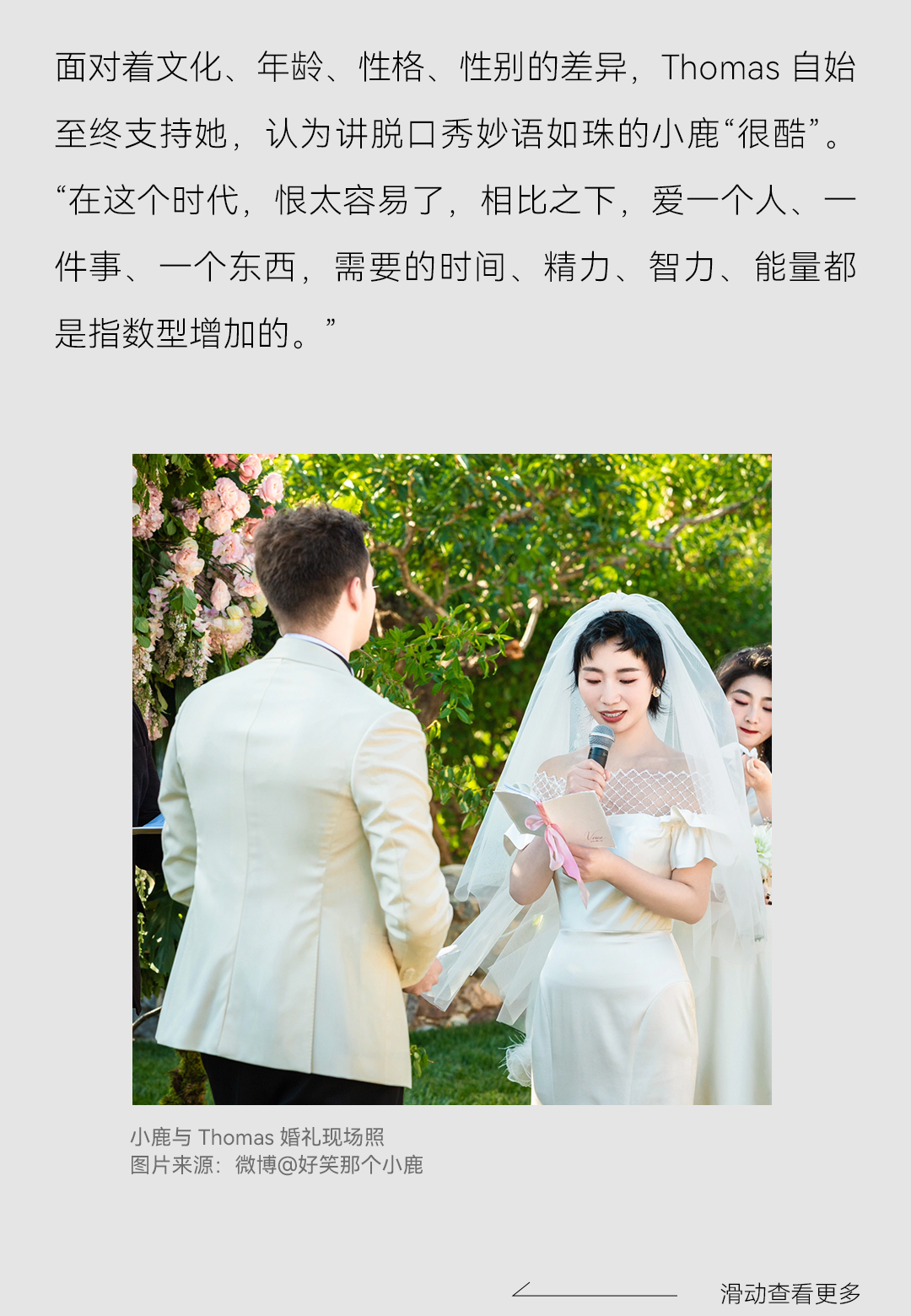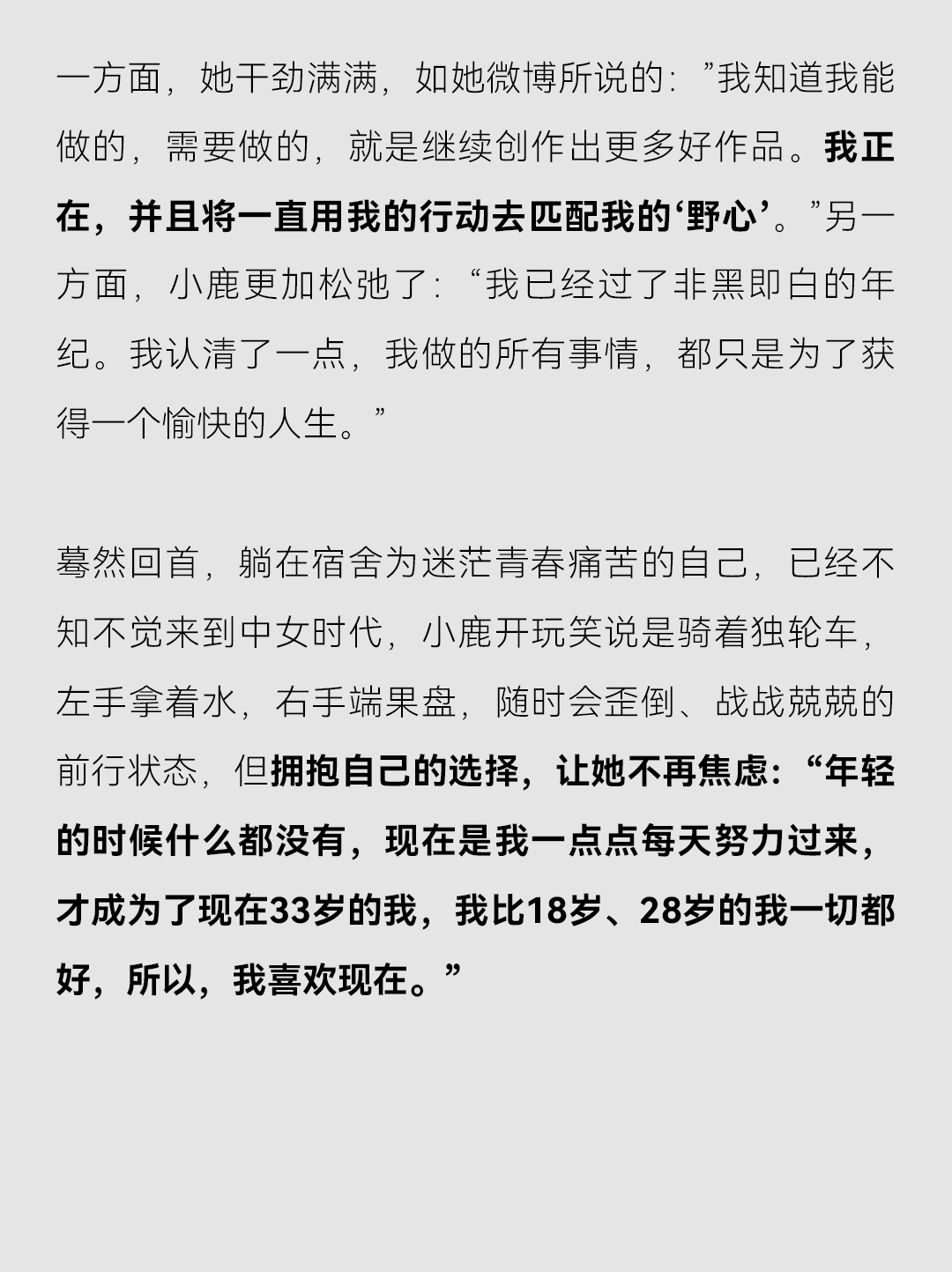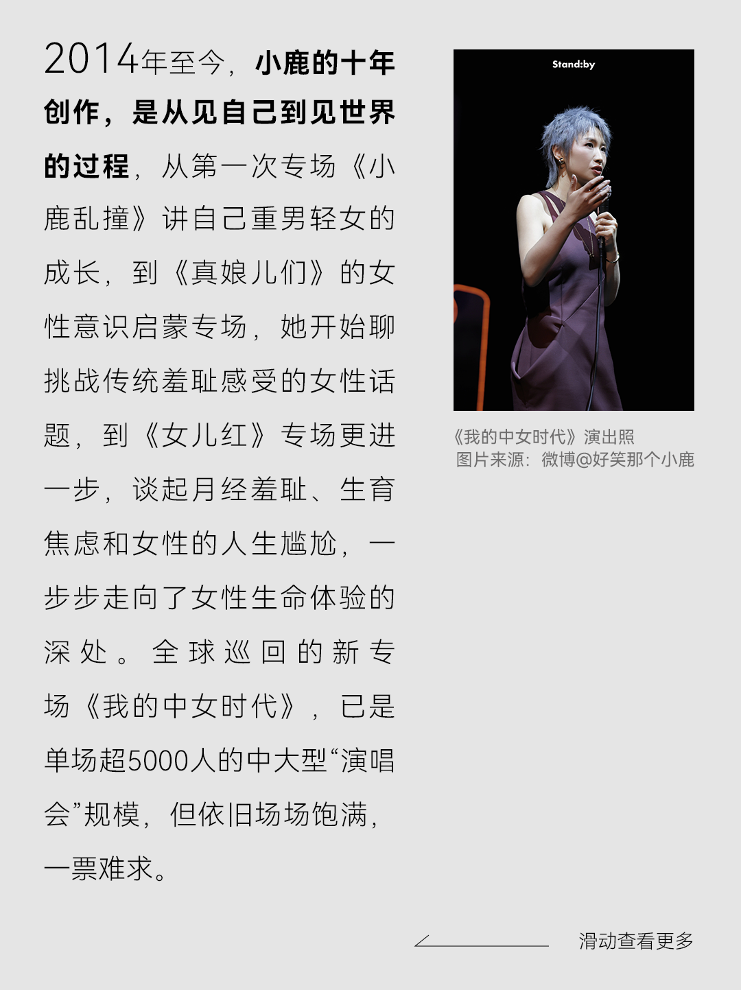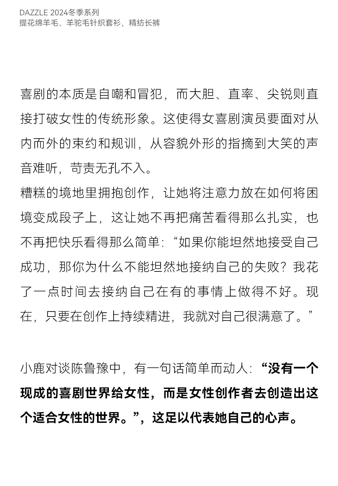 拥抱是最美的姿态。DAZZLE始终以拥抱者的态度开放且谦逊、乐观并自由地与普世之美共情相拥。 今年喜剧综艺《喜剧之王单口季》的舞台上,小鹿一改过往成熟律师风的西装造型,穿上婚纱,戴着头纱,以女性的细腻与轻盈语气聊起了自己的婚姻生活,将生活那些避而不谈、小心翼翼、有所顾忌的部分,堂堂正正展现出来。走入脱口秀的10年,是小鹿卸下困境的盔甲、迈向自信的人生旅途,她也成为了观众心中的闪闪发光的“脱口秀女王”。 本期,DAZZLE闪光人物将镜头对准脱口秀演员小鹿。拥抱真实的内心,将热爱变为新生 从律师到脱口秀演员:“大家都说那是对的,但是我知道什么是适合自己的,这是觉醒的开始。” 小鹿的脱口秀之梦,开始于“小镇做题家”即将走入社会的23岁。出生于重男轻女的云南农村,她是村里第一个女大学生,在重点大学读法学。准备考博时,她看到了国外的单口喜剧,萌发了一个想法:希望以聪明的形象把人逗笑。 觉醒之际,小鹿果断地拥抱了真实的内心声音。“当时法学生的出路,好像都不是我很想做的事——大家都说那是对的,但是我知道什么是合适自己的,这时候才开始慢慢有觉醒的意识。我发现脱口秀这件事时,就觉得自己得去试一试。我们要尽量去更大的世界里,因为更大的世界才能接受我们的奇形怪状。”于是,她跳上了去北京的绿皮火车,去学脱口秀。 她要表达什么? 从2014年开始,小鹿在北京,白天做律师,晚上一路迢迢去城市另一头,风雨无阻地出现在脱口秀开放麦上,这是为了拥抱最直接的反馈——观众真实的笑声,意味着不断创作、测试、验证,直面冷场和质疑,随之而来的再创作,有序地推动边界。有时候一下台,小鹿迫不及待地当场就打开电脑开始修改。 “只要大笑一次,我就像进入生命中的驿站,整个人被放在水里涮了一下,再回来,又有了点儿精神抖擞的样子。”在小鹿看来,笑声特别科学,观众没笑,就说明段子不行。 拥抱内心的创作,不刻意地“搞笑”,没有故作深刻的“说教”,小鹿在舞台上真实、自然、不做作的表达,来自天道酬勤的习惯。学生时代她就有一个蓝色笔记本,上面记满了各种笑话。2014登上脱口秀舞台后,小鹿在电脑上建了一个文件夹,取名叫“你到底要表达什么?”,她开始认真思考自己生活里的真实困扰,那时她写下的第一个段子,是关于女孩子的容貌焦虑。 从“可预知”跳脱,拥抱新人生 从律师到脱口秀,对小鹿并没有明显的转变情景:“人生就是量变引起质变的过程,没有这么多抓马的瞬间,那些都是电影拍出来的。我一直都挺坚定的,在北京做律师是为了能稳定地做脱口秀。” 2021年,小鹿正式注销了律师证,开始做全职脱口秀演员。她看清自己天性与律师工作的不适配,并在生命变化中看清“可预知式”生活的虚妄。 “即便是面对三四十个人观众,但我还是拥有能让他们开心的能力,这对我很重要。” 拥抱真挚的创作,爱现在的自己 “没有一个现成的喜剧世界给女性,而是女性创作者去创造出这个适合女性的世界。“ 喜剧的本质是自嘲和冒犯,而大胆、直率、尖锐则直接打破女性的传统形象。这使得女喜剧演员要面对从内而外的束约和规训,从容貌外形的指摘到大笑的声音难听,苛责无孔不入。 糟糕的境地里拥抱创作,让她将注意力放在如何将困境变成段子上,这让她不再把痛苦看得那么扎实,也不再把快乐看得那么简单:“如果你能坦然地接受自己成功,那你为什么不能坦然地接纳自己的失败?我花了一点时间去接纳自己在有的事情上做得不好。现在,只要在创作上持续精进,我就对自己很满意了。“ 小鹿对谈陈鲁豫中,有一句话简单而动人:“没有一个现成的喜剧世界给女性,而是女性创作者去创造出这个适合女性的世界。”,这足以代表她自己的心声。 创作十年,从女性意识启蒙到中女时代觉醒 2014年至今,小鹿的十年创作,是从见自己到见世界的过程,从第一次专场《小鹿乱撞》讲自己重男轻女的成长,到《真娘儿们》的女性意识启蒙专场,她开始聊挑战传统羞耻感受的女性话题,到《女儿红》专场更进一步,谈起月经羞耻、生育焦虑和女性的人生尴尬,一步步走向了女性生命体验的深处。全球巡回的新专场《我的中女时代》,已是单场超5000人的中大型“演唱会”规模,但依旧场场饱满,一票难求。 一方面,她干劲满满,如她微博所说的:”我知道我能做的,需要做的,就是继续创作出更多好作品。我正在,并且将一直用我的行动去匹配我的‘野心’。”另一方面,小鹿更加松弛了:“我已经过了非黑即白的年纪。我认清了一点,我做的所有事情,都只是为了获得一个愉快的人生。” 蓦然回首,躺在宿舍为迷茫青春痛苦的自己,已经不知不觉来到中女时代,小鹿开玩笑说是骑着独轮车,左手拿着水,右手端果盘,随时会歪倒、战战兢兢的前行状态,但拥抱自己的选择,让她不再焦虑:“年轻的时候什么都没有,现在是我一点点每天努力过来,才成为了现在33岁的我,我比18岁、28岁的我一切都好,所以,我喜欢现在。“ 爱情,是“谢谢你,带我爱上我自己” 小鹿从不避讳分享自己的爱情生活,她与小5岁的澳大利亚老公Thomas,相识相爱、分手复合到结婚携手,笑与泪齐飞的真切感受呈现在脱口秀的舞台上下,在今年的舞台上,小鹿穿着婚纱,以备婚为主题的表演,包袱不断,成为了热门话题。 面对着文化、年龄、性格、性别