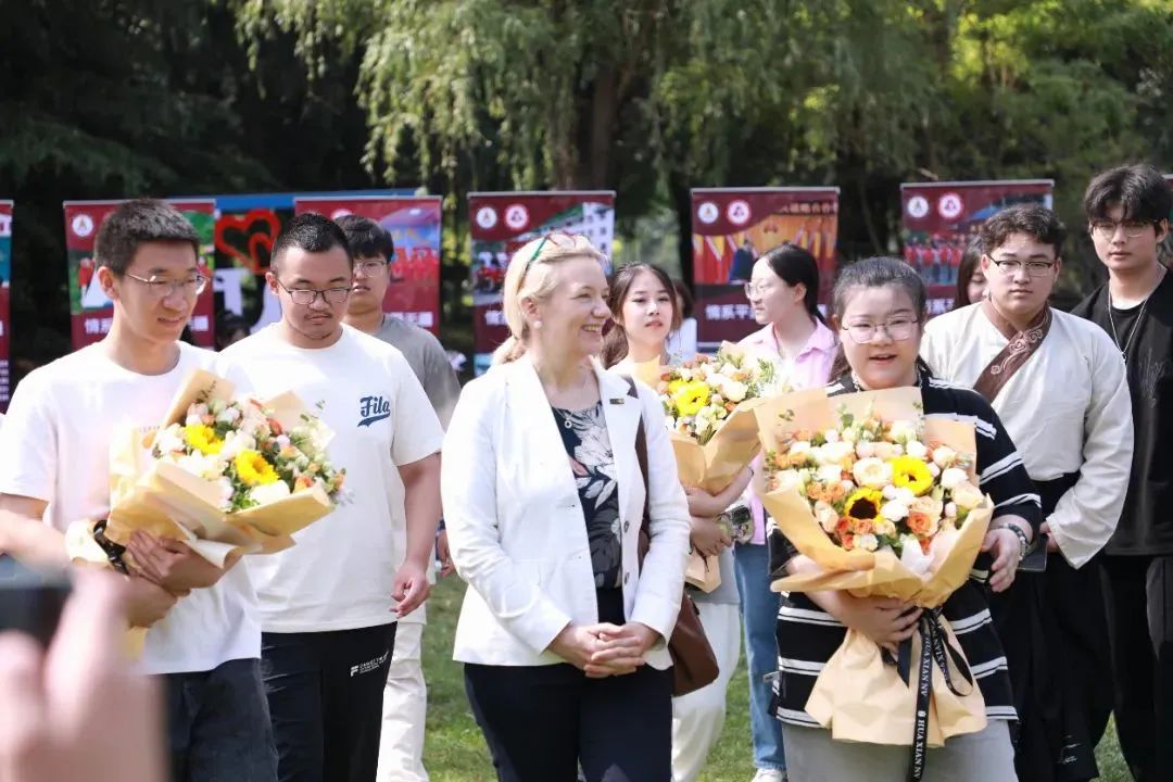 ·欢迎露西·万圭、赠送礼物·学生与露西·万圭在学院文化特色展示区互动:汉服社展示中国汉服文化并邀其体验汉服