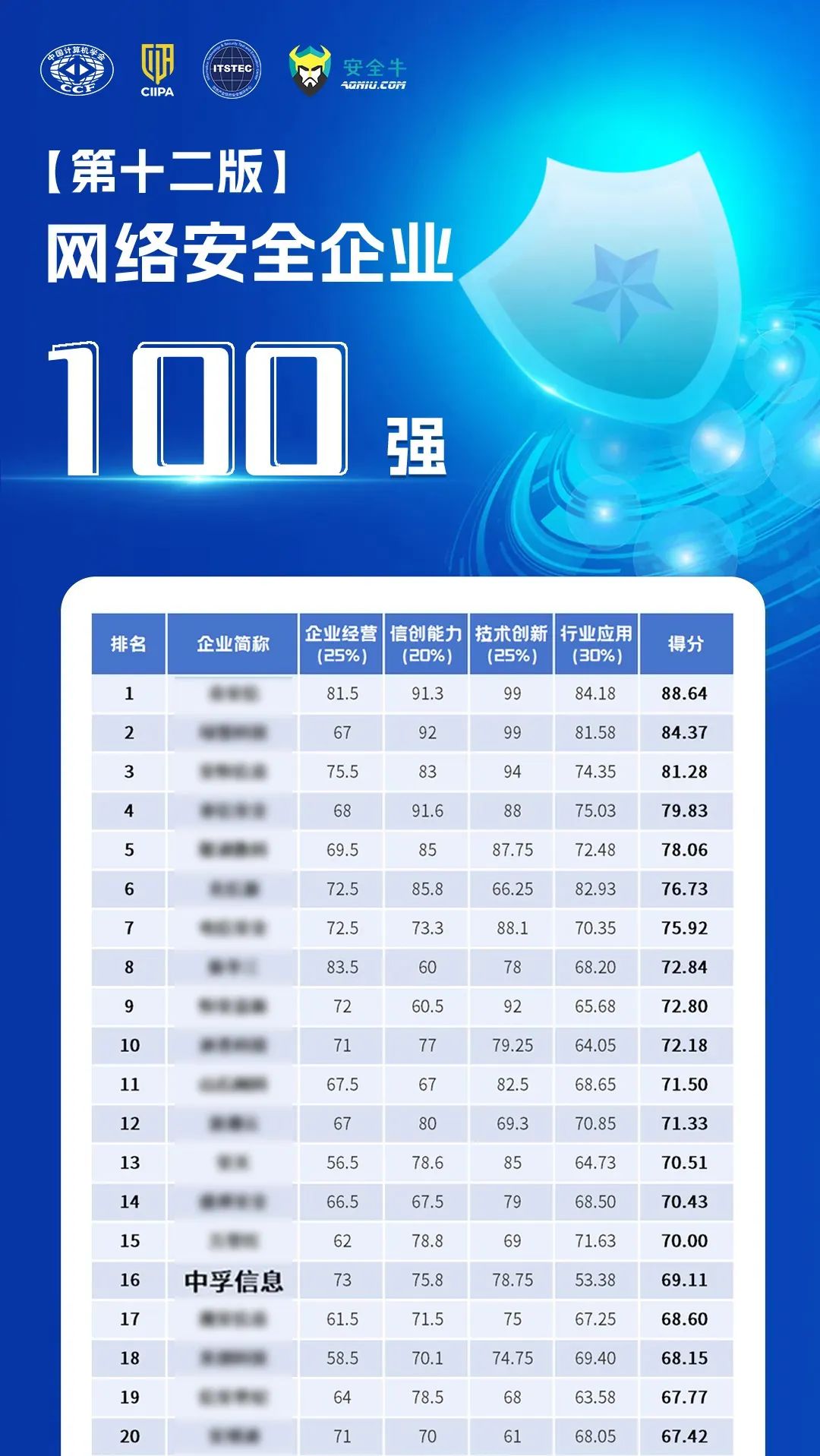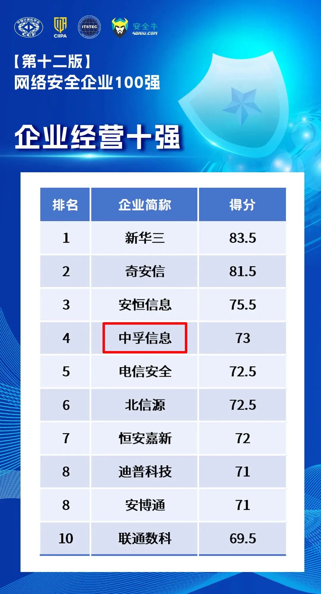 中国计算机学会(CCF)抗恶劣环境计算机专委会、中关村华安关键信息基础设施安全保护联盟、信息产业信息安全测评中心、安全牛联合发布第十二版《网络安全企业100强》,中孚信息斩获“网络安全企业100强”第十六名,同时实力入选“企业经营十强”第四名。