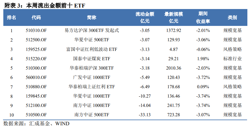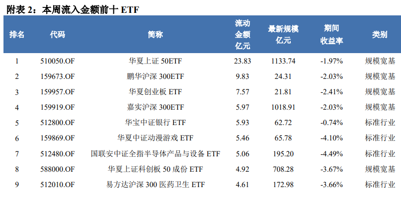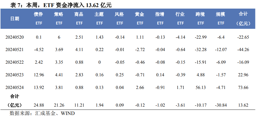 1、宽基ETF:本周,ETF资金净流入13.62亿元。其中,债券ETF流入最多,净流入24.88亿元;规模ETF流出最多,净流出30.84亿元。详情见附表2和3。