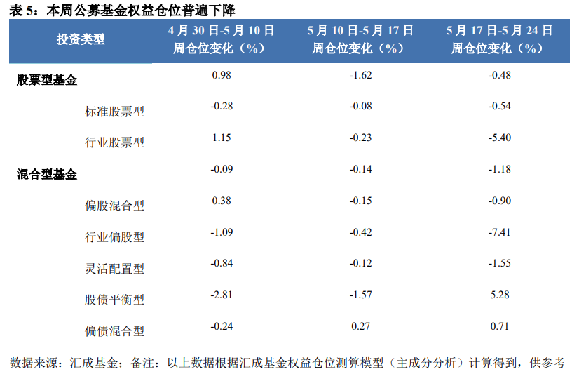 1、权益基金仓位测算:本周公募基金权益仓位普遍下降。截至5月24日,采用主成分分析法测算的基金仓位中,公募基金权益仓位普遍下跌。股票型基金权益仓位测算结果较5月17日下跌0.48个百分点;混合型基金权益仓位测算结果较5月17日下跌1.18个百分点。子类别中,行业偏股型基金仓位下跌最多,测算结果较5月17日下跌7.41个百分点。