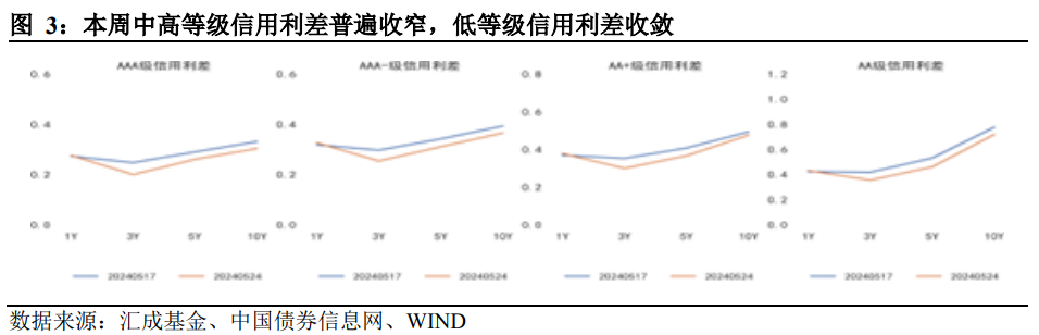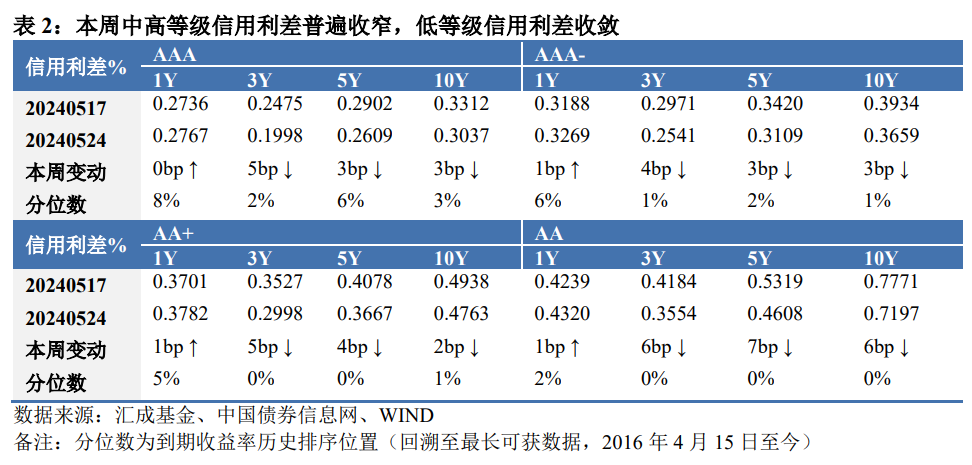 2、债券市场:本周各期限国债和国开债收益率涨跌不一。其中,6M国开债收益率上行幅度最大,为9BP。本周中高等级信用利差普遍收窄,低等级信用利差收敛。