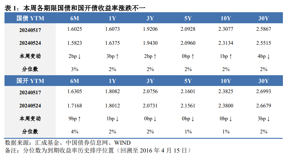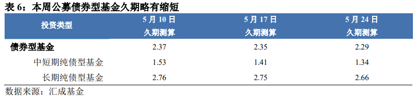 2、债券基金久期测算:截至5月24日,公募债券型基金久期较上周略有缩短,预测结果为2.29年。