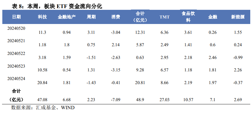 2、行业ETF:本周,各板块ETF资金流向分化,其中流入最多的为科技板块ETF(21.51亿元),流出最多的为消费板块ETF(-11.34亿元)。行业中,TMT行业ETF流入最多(10.82亿元),新能源行业ETF流出最多(-2.40亿元)。
