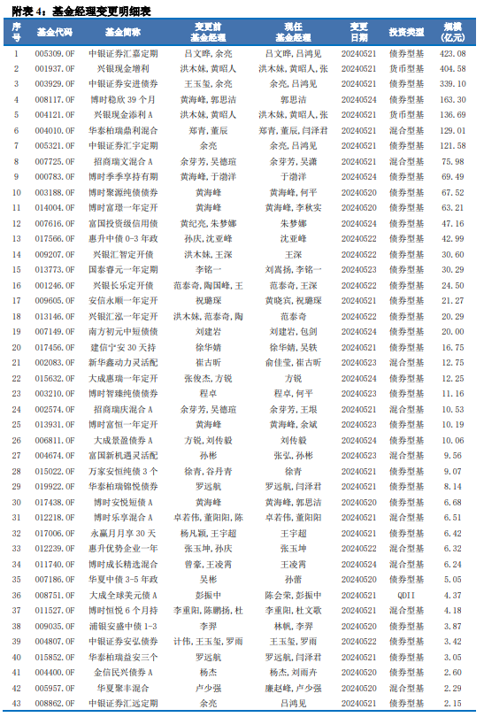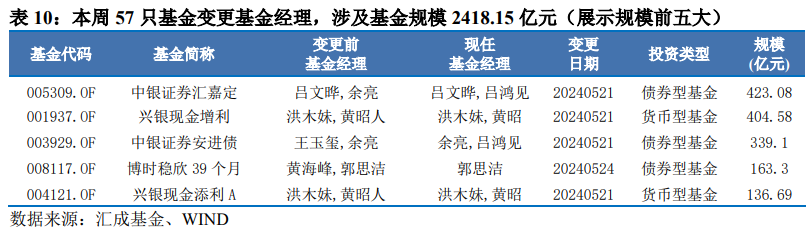 基金经理变更方面,本周有57只公募基金产品公告基金经理变更,累计涉及基金规模为2418.15亿元。其中,债券型基金35只,规模合计1601.44亿元;混合型基金17只,规模合计267.94亿元;货币型基金4只,规模合计544.4亿元;QDII1只,规模合计4.37亿元。详情请见附表4。