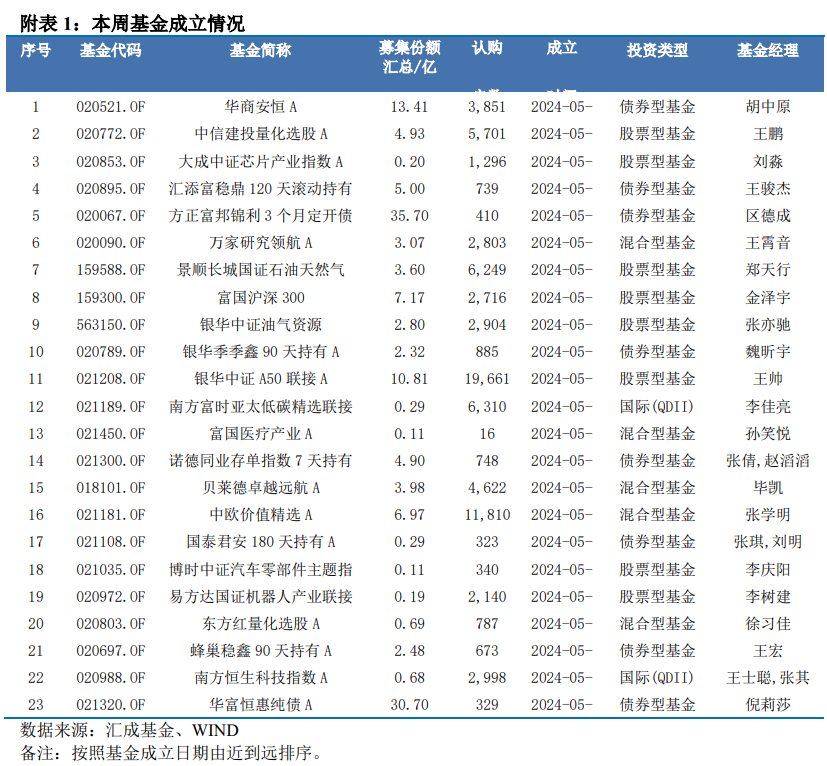 1、当周新发:基金发行方面,本周共有23只基金成立,合计募集资金140.40亿元。其中,债券型基金8只,募集规模94.8亿元;股票型基金8只,募集规模29.81亿元;混合型基金5只,募集规模14.82亿元;国际(QDII)基金2只,募集规模0.97亿元。详情请见附表1。