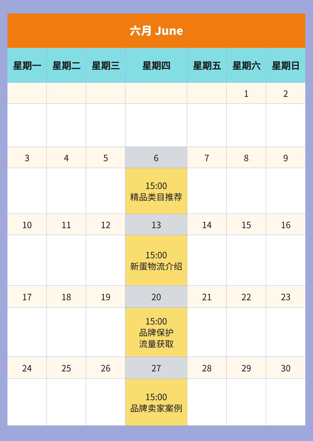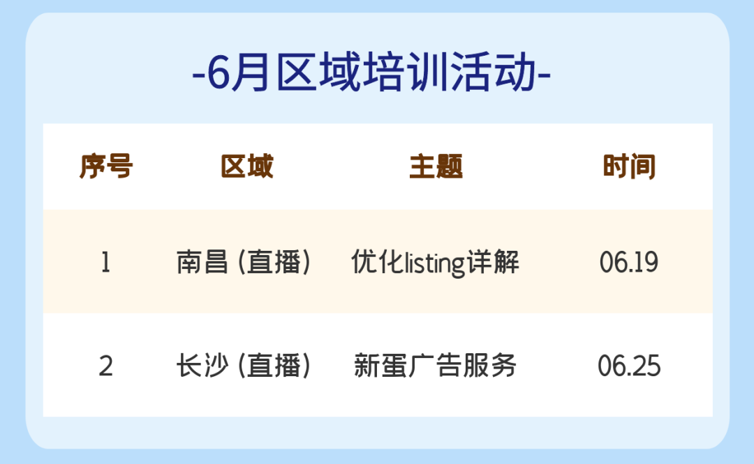 6月已经到来!我们为卖家准备了月度线上培训活动,向卖家提供经营建议,助力卖家Q2最后一个月圆满收官,顺利开启Q3!