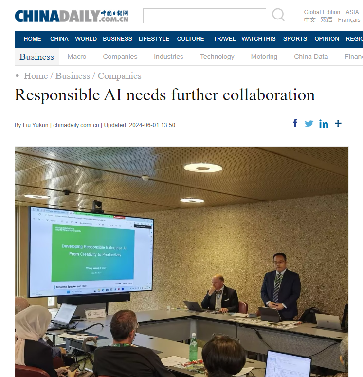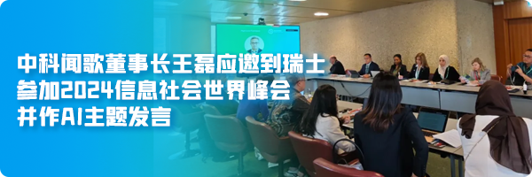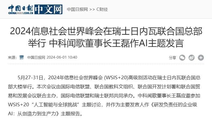5月27-31日,2024年信息社会世界峰会 (WSIS+20)高级别活动在瑞士日内瓦联合国总部大楼举行。本次会议由国际电信联盟、联合国教科文组织、联合国开发计划署和联合国贸易和发展会议联合主办,国际电信联盟和瑞士联邦共同承办。中科闻歌董事长王磊应邀参加WSIS+20“人工智能与全球挑战”主题讨论,并作为主要发言人作《研发负责任的企业级AI:从创造力到生产力》主题报告。