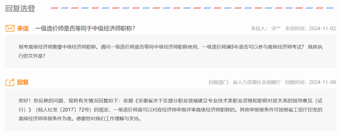 近日,安徽省人力资源和社会保障厅明确了“一级造价师是否等同于中级经济师职称”这个问题。