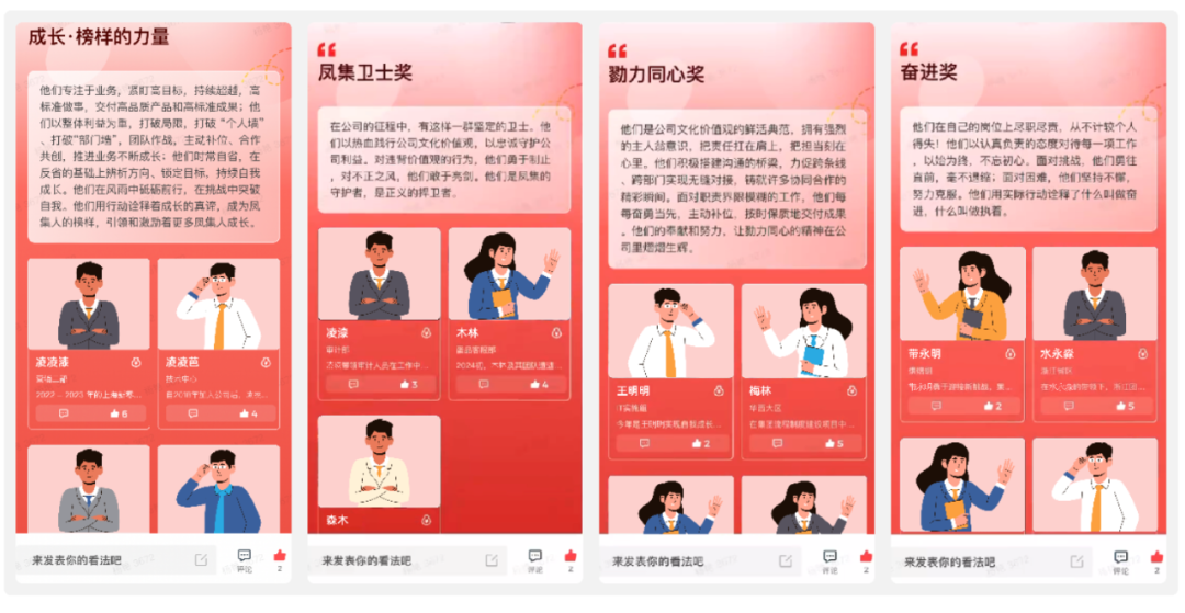 灯塔阁是凤集榜样表彰与正能量传播的阵地。在荣誉激励方面,公司会通过颁发司庆、年度评优、“每月之星”评选及司龄勋章,树立并表彰先进榜样,增强员工的荣誉感。深入挖掘和展示榜样人物的先进事迹和优秀品质,去挖掘员工“相信:什么是重要的;坚信:什么是对的;明白:什么是该做的“主题文化故事,营造积极向上的榜样文化氛围。灯塔阁的运营有效激发了员工的荣誉感和责任感,促进了团队之间的良性竞争与合作。优秀员工的事迹成为大家学习的榜样,正能量的传播激励着更多人追求卓越、勇于担当。同时,灯塔阁还增强了员工的归属感和团队凝聚力,让大家在共同的目标与愿景下携手前行,共创辉煌。