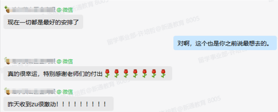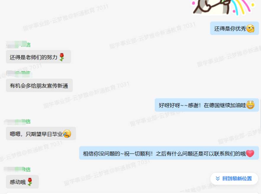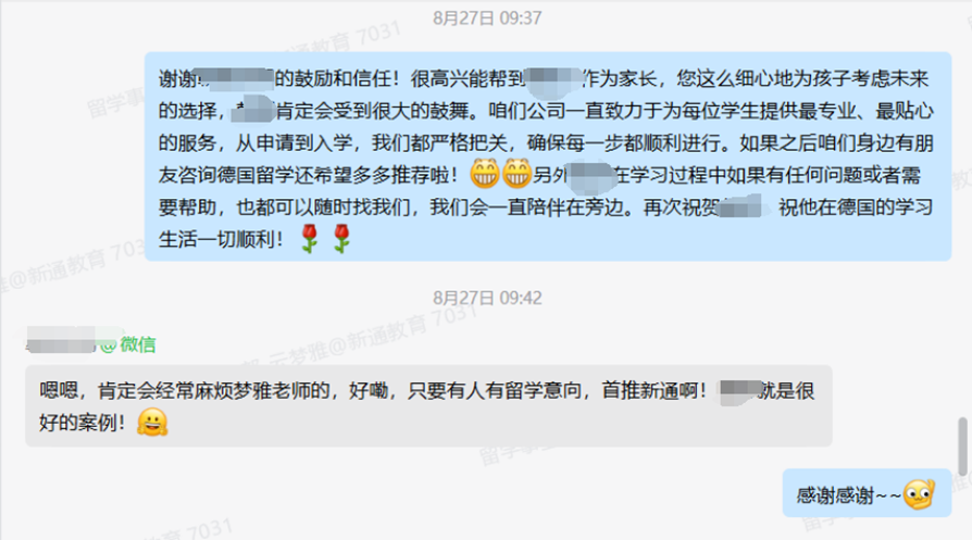 顺利拿到录取结果,是对学生和老师的最大肯定。学生和家长的对新通德国留学服务的好评是我们存在的意义,也是奋战下一个申请季的最强动力!