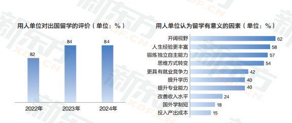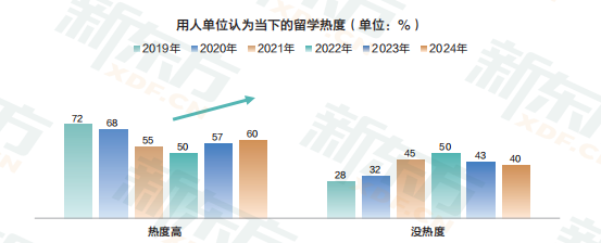 根据新东方发布的2024年《中国学生出国留学发展报告》显示,从招聘趋势看,越来越多的用人单位表示愿意招聘留学生,他们认为留学能够给学生带来积极的影响,能够使学生开阔视野、增加人生经验、锻炼独立自主的能力、转变思维方式。这些能力能够被应用在工作中,帮助留学生胜任工作内容。
