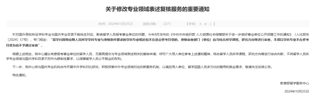 近日,教育部留学服务中心发布了【报考事业单位的留学生无需进行专业复核申请】的通知。