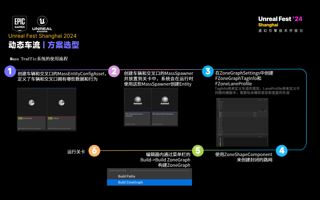 先创建车辆和交叉口的EntityAsset,然后放置并配置MassSpawner,配置TagInfo和LaneProfile,绘制ZoneShapeComponent,再点击Build ZoneGraph构建ZoneGraph,最后运行关卡,虚幻引擎就会自动生成可以动的车流。