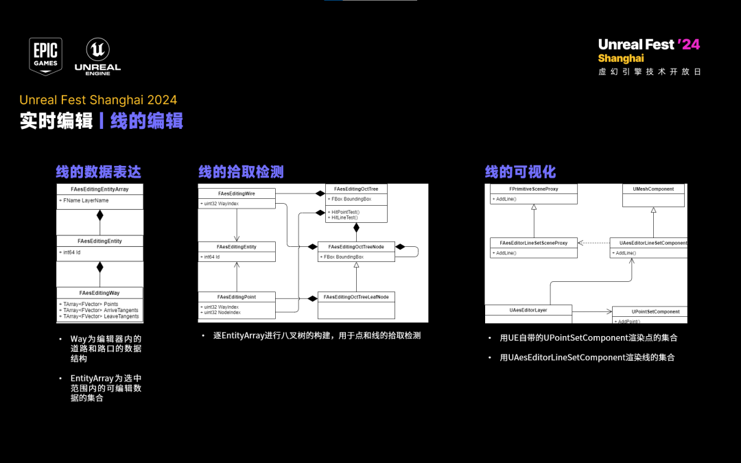Way为编辑器内的道路和路口的数据结构。EntityArray为选中范围内的可编辑数据的集合。每个EntityArray都会进行八叉树的构建,用于点和线的拾取检测。渲染数据时,则用UE自带的UPointSetComponent渲染点的集合,用UAesEditorLineSetComponent渲染线的集合。