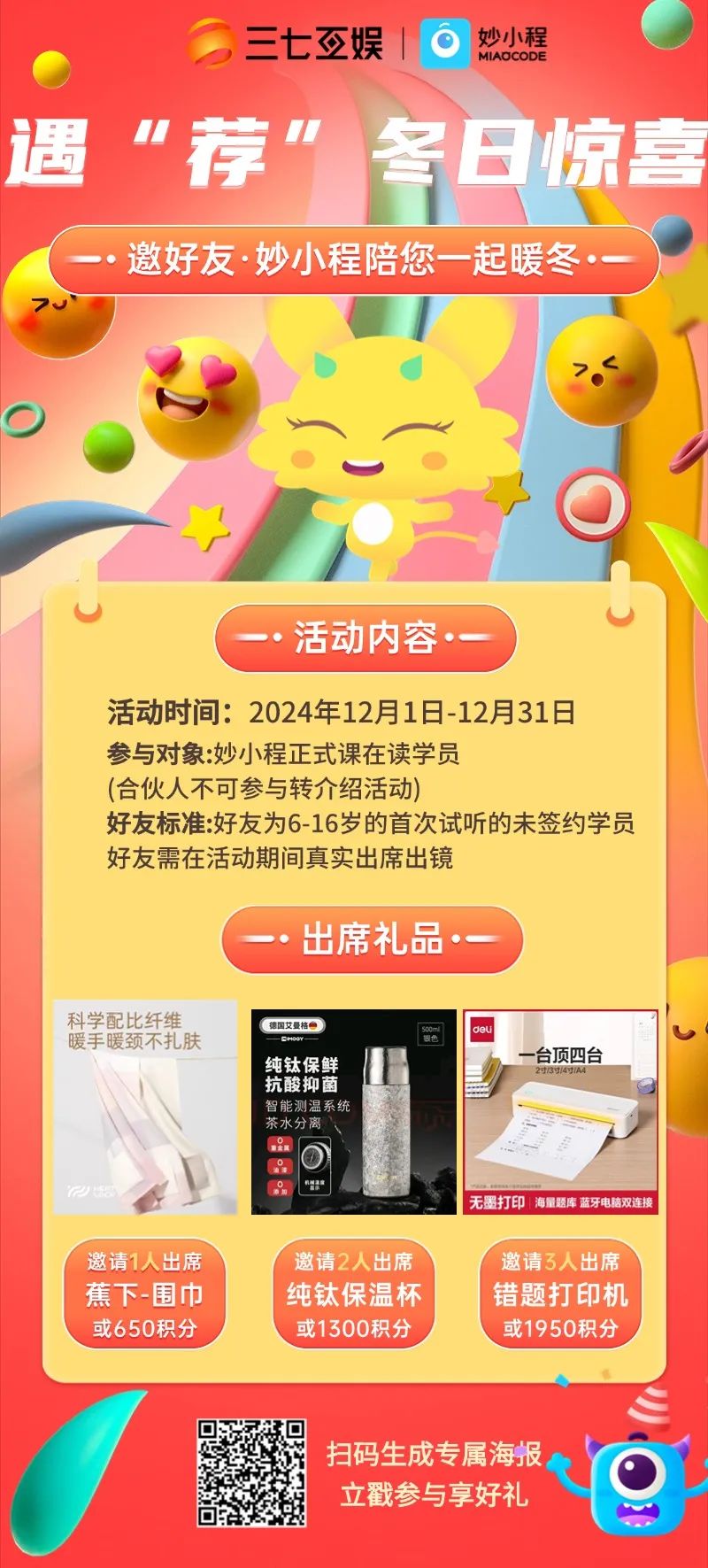 活动内容:邀请好友试听妙小程编程课程,即刻获得多种好礼