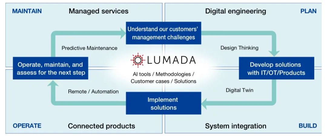 Lumada的基本方针是“让客户的数据熠熠生辉,从而形成新的知识,为客户解决经营问题和业务增长做出贡献”。