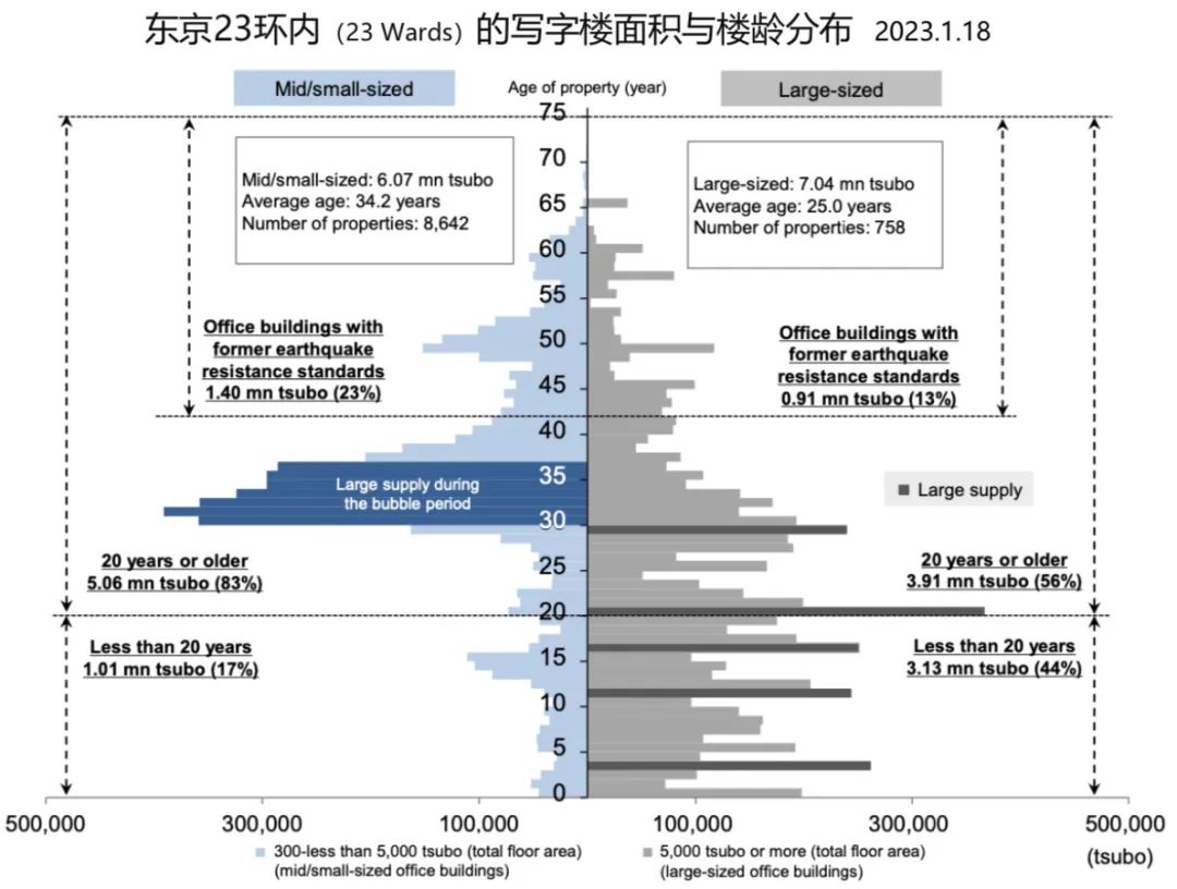下图中可以看到,在近20年中,东京经济圈小写字楼的供应已经远远不及大型写字楼供应,在有限的存量基础上,中小写字楼已然成为稀缺性物业。此外,大部分东京圈中小写字楼都属于日本泡沫经济时代的遗留产物,建筑平均年限达到了34.2年,对比大型写字楼略显陈旧,但却依然保留有较好的物业属性与区域位置。
