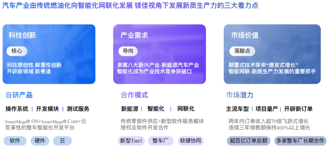 她表示,科技创新、产业需求、市场价值是镁佳科技视角下发展新质生产力的三大着力点。汽车行业正在经历百年未遇之大变革,面对愈发激烈的行业竞争,汽车智能化成为新能源汽车行业的技术竞争突破口。而其中,软件优化成为车企以小博大、以更低成本让用户得到更好体验的最优选择。
