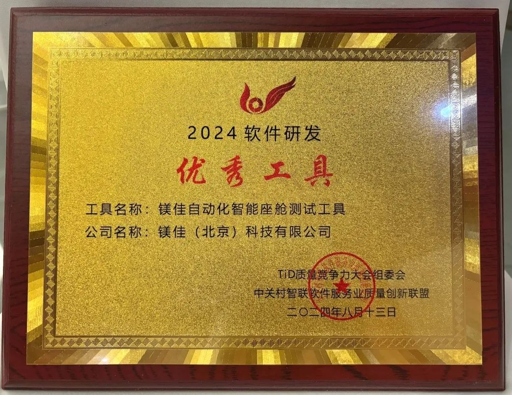 会上,镁佳科技智能座舱自动化测试工具作为“智能网联汽车产业的新质生产力”的代表产品,获评“2024软件研发优秀工具”。