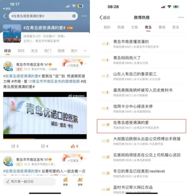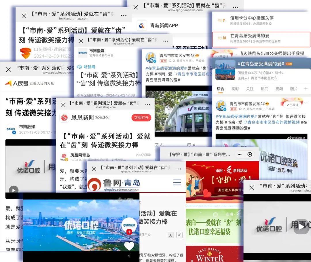 此次活动不仅吸引了广大市民的积极参与,还在各大媒体平台引发了广泛关注,为此,青岛市市南区人民政府新闻办公室官方微博基于此次优诺口腔与市南融媒的联合活动,于12月3日在其发起的微博话题——#在青岛感受满满的爱#中也做了内容发布,发布当晚登上了微博青岛热搜第10名,成为当地的热门话题。