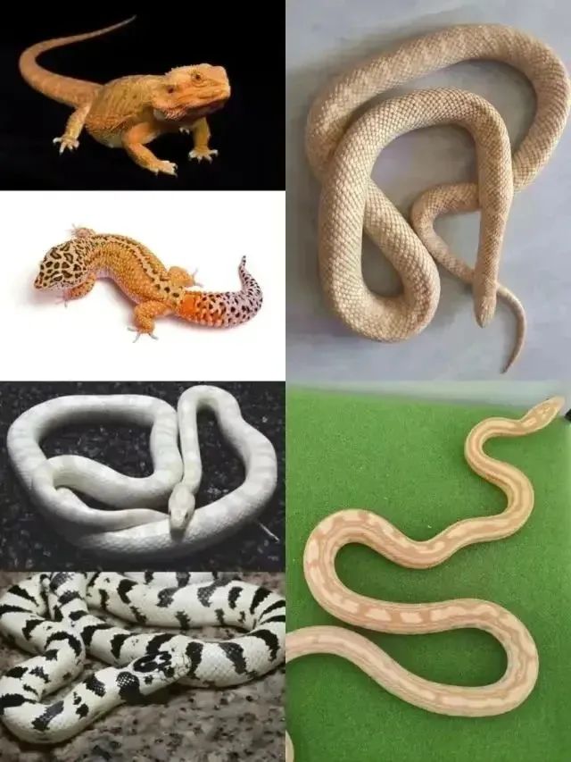 鬃狮蜥、豹纹守宫、暴风雪玉米蛇、黑白王蛇、