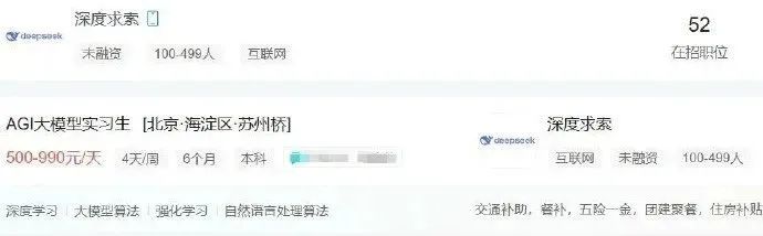 某招聘平台显示,杭州深度求索人工智能(AI)基础技术研究有限公司即DeepSeek(以下简称DeepSeek)发布了多个岗位的招聘信息。
