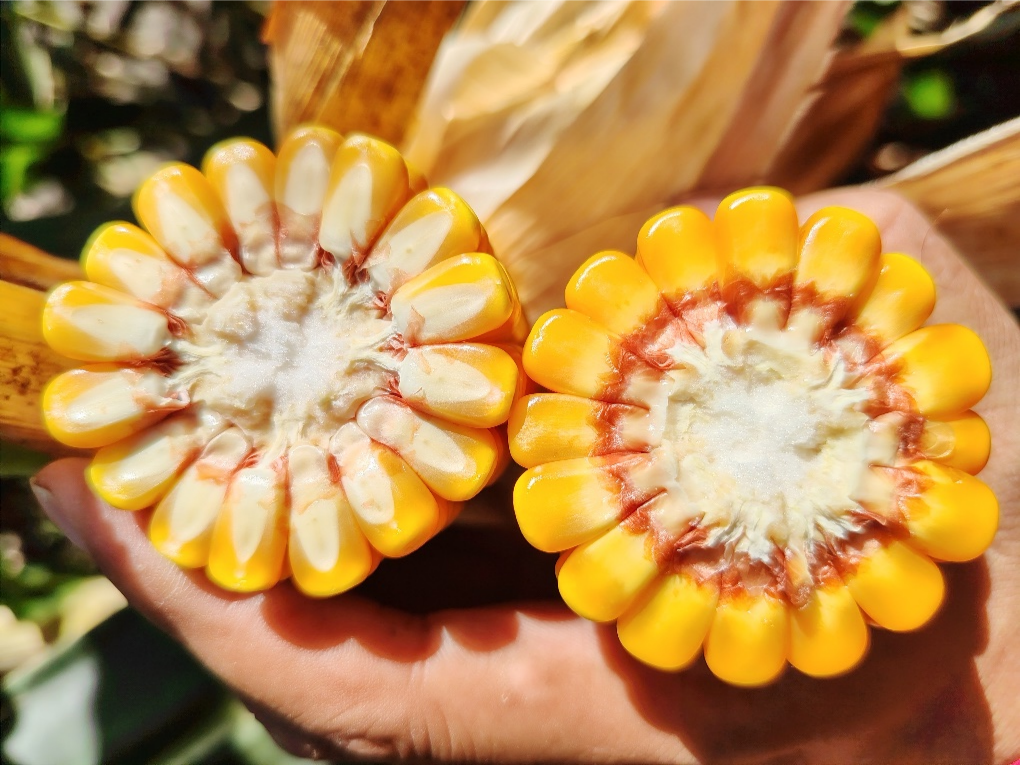 籽粒:籽粒黄色,半马齿,百粒重35.3克。籽粒容重764克/升,粗淀粉含量76.41%,粗蛋白含量8.02%,粗脂肪含量4.93%,赖氨酸含量0.25%。