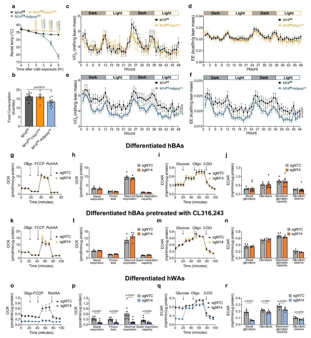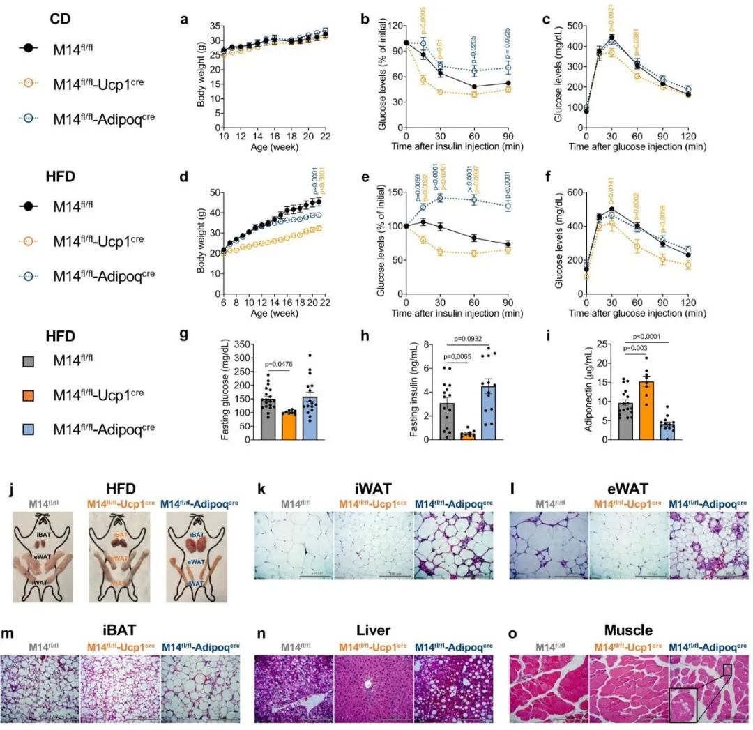 通过构建两种基因敲除小鼠模型(M14fl/fl-Ucp1cre和M14fl/fl-Adipoqcre),研究发现METTL14缺失在BAT和WAT中对全身胰岛素敏感性有相反的调节作用。研究发现,BAT中特异性敲除METTL14的小鼠展现出改善的胰岛素敏感性和更好的葡萄糖耐受性,且这种改善不依赖于BAT的产热活性,而是通过调节其分泌的内分泌因子来实现。而在WAT中,METTL14的缺失导致了白色脂肪细胞的凋亡,进而破坏了胰岛素敏感性,导致全身性胰岛素抵抗。这表明,METTL14在不同脂肪组织中的作用高度特异,并且其缺失对代谢的影响在BAT和WAT中存在截然不同的生理后果。