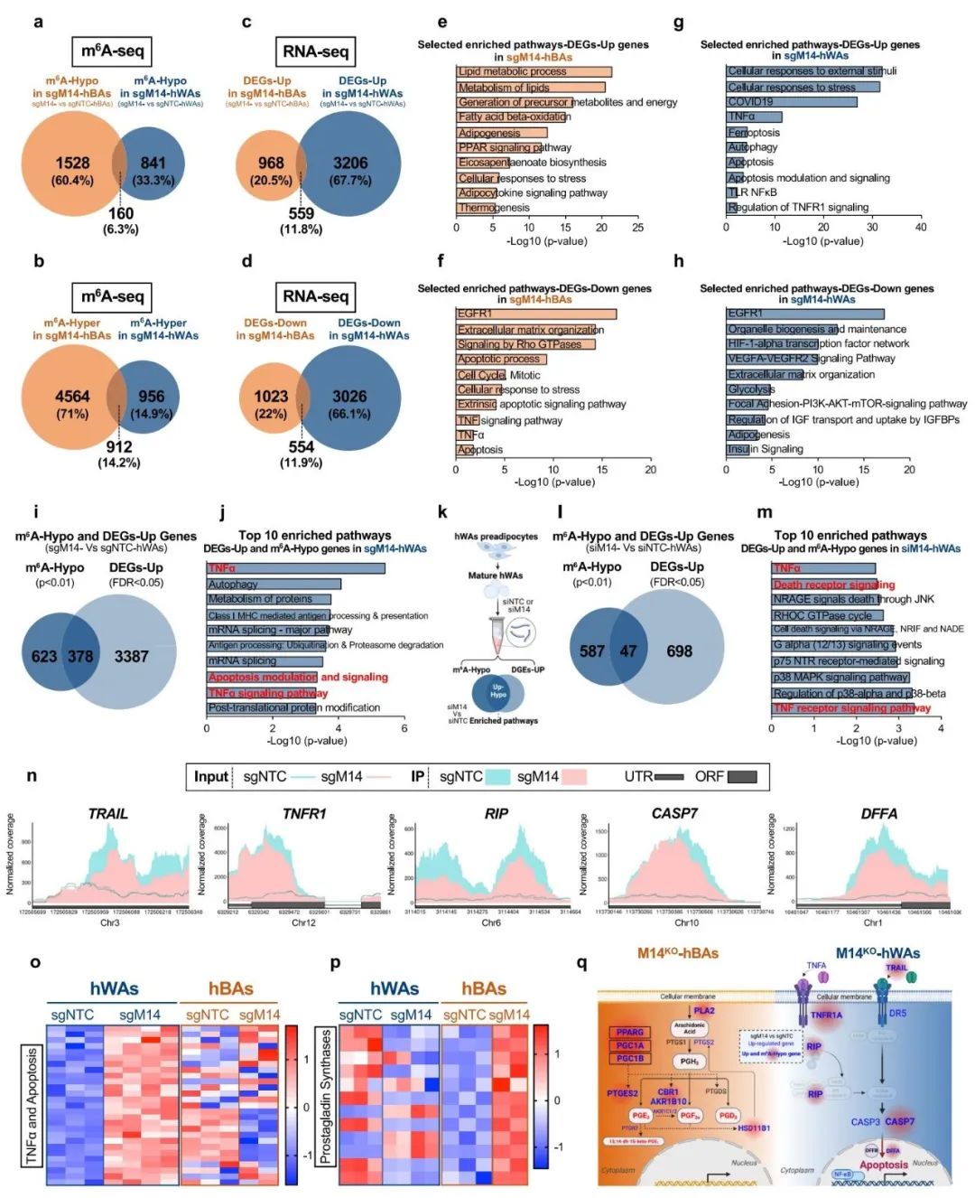 在人体棕色脂肪细胞(hBAs)和白色脂肪细胞(hWAs)模型中,通过比较sgM14-hBAs和sgM14-hWA细胞中m6A低甲基化基因,发现只有160个共同低甲基化基因和912个高甲基化基因,以及559个共同上调基因和554个共同下调基因。在hBA细胞中,METTL14缺失导致脂质代谢和磷脂过程相关通路上调,凋亡和TNFα信号通路下调;在hWA细胞中,METTL14缺失主要导致TNFα和凋亡通路以m6A依赖的方式上调,同时导致EGFR1、focal adhension-PK3K-AKT-mTOR和胰岛素信号通路下调。通过这些差异化的m6A调控,METTL14在两种脂肪细胞类型中发挥了不同的代谢调节作用。
