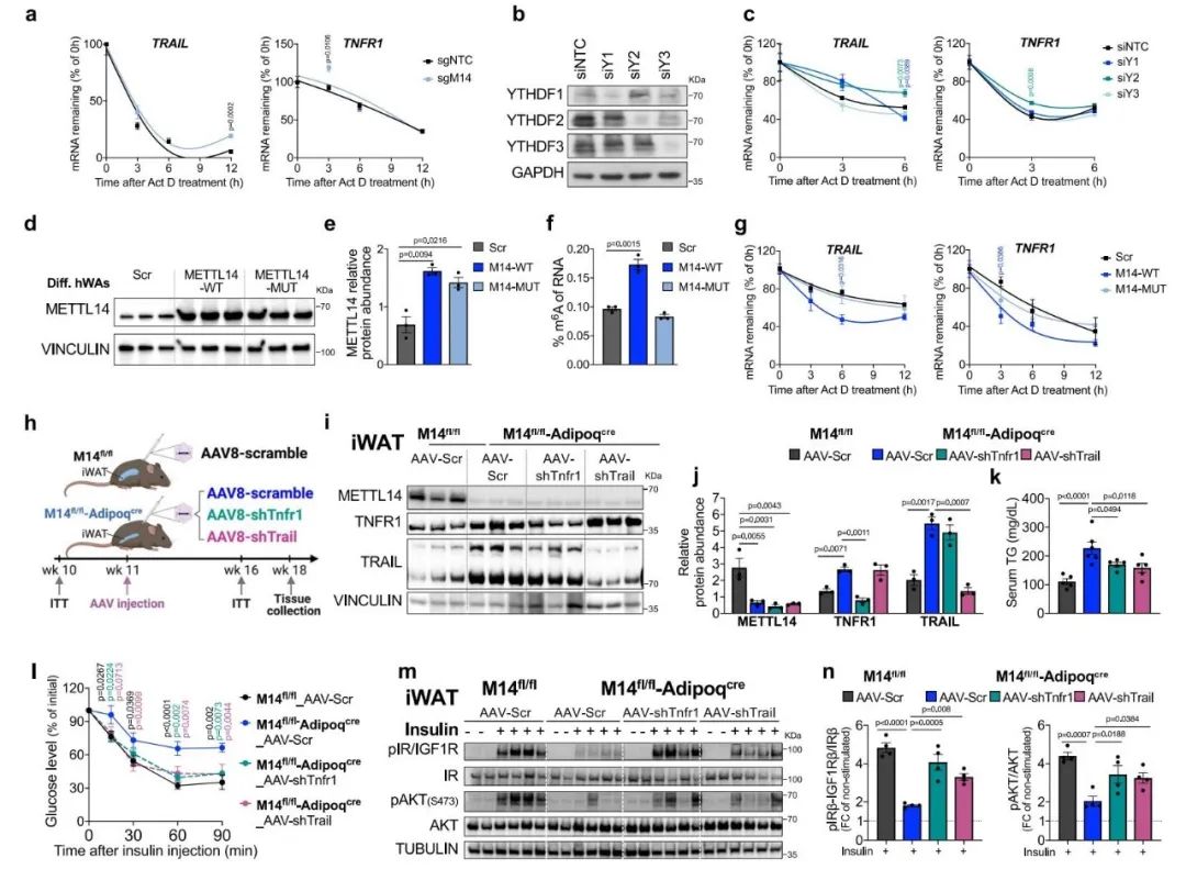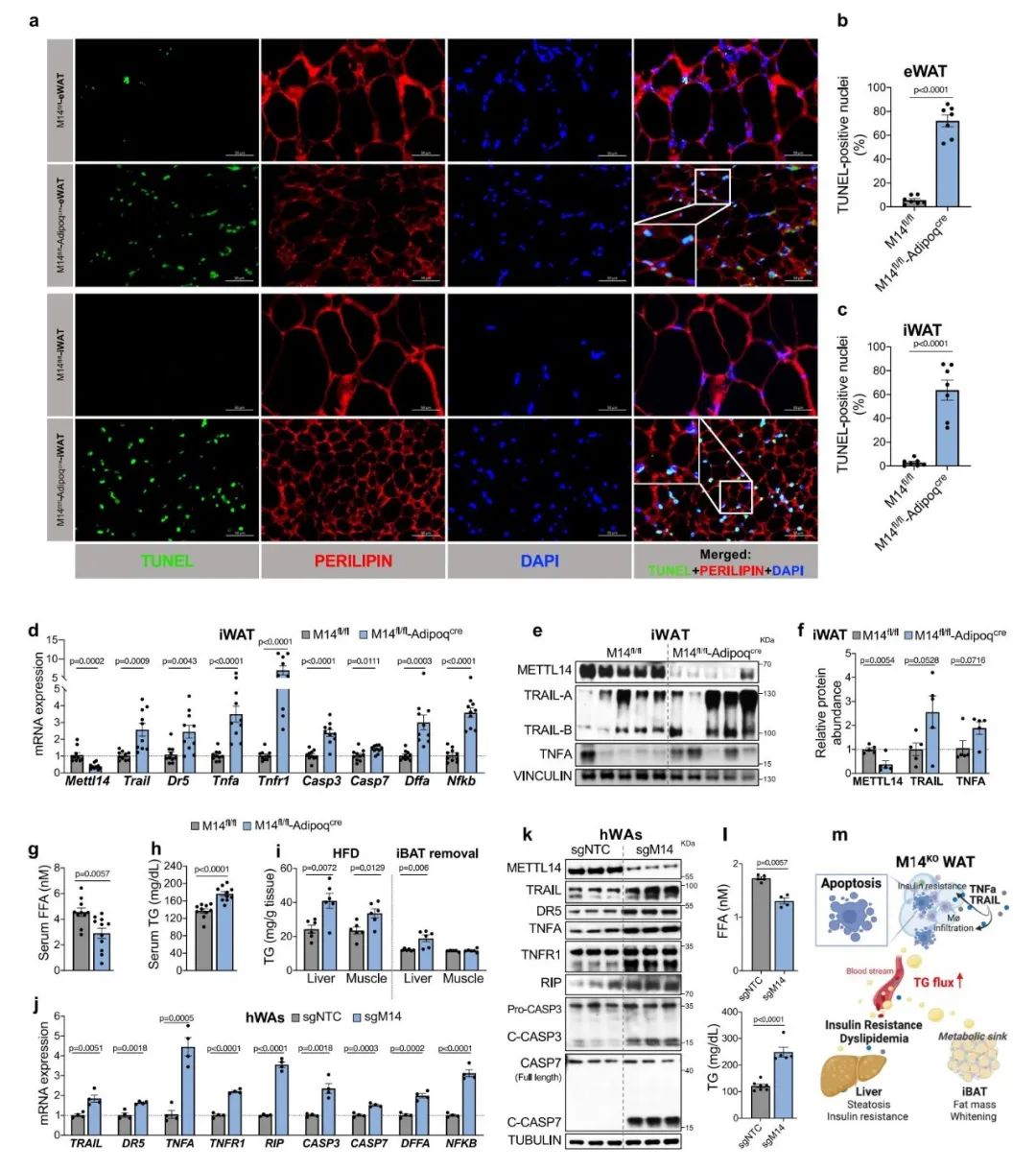 在M14fl/fl-Adipoqcre小鼠的iWAT和eWAT中进行TUNEL检测,发现METTL14缺失导致白色脂肪细胞凋亡增加。在细胞水平上,M14fl/fl-Adipoqcre小鼠的iWAT中,Trail、Dr5、Tnfα、Tnfr1、Casp3、Casp7和Dffa等凋亡相关基因在mRNA水平上调,TRAIL和TNFA蛋白丰度增加;在分化的sgM14-hWA细胞中,也观察到凋亡标记基因的表达和蛋白丰度增加,同时FFA水平降低,TG水平升高。这一过程的发生可能与WAT中脂肪细胞的死亡和代谢紊乱有关,导致脂肪组织的功能受损,进而影响全身代谢和胰岛素敏感性。