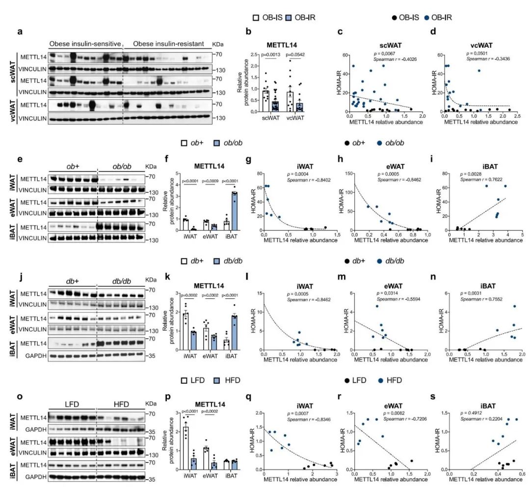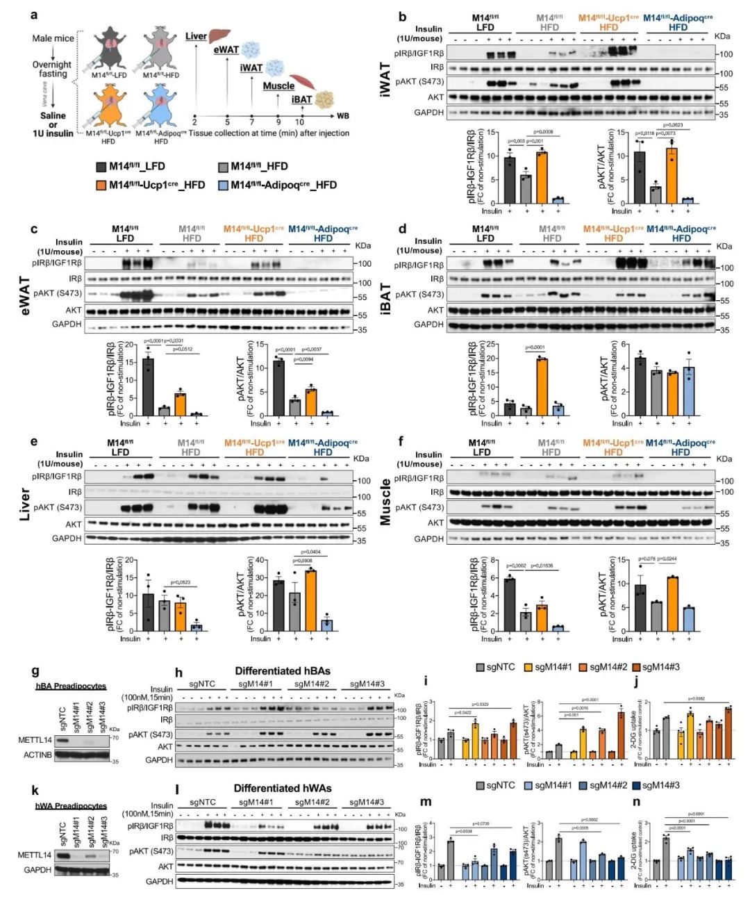 在进一步分析中,研究团队考察了METTL14缺失在不同外周代谢组织(如肝脏、肌肉、脂肪组织)中的胰岛素敏感性变化。研究发现,在BAT中特异性敲除METTL14的小鼠表现出更高的胰岛素敏感性,尤其是在肝脏和肌肉中显示出更强的胰岛素信号。然而,在WAT中特异性敲除METTL14的小鼠则出现了胰岛素信号传导的减弱,肝脏和肌肉的胰岛素响应明显受限。整体来看,METTL14的缺失通过调节不同组织中的胰岛素信号通路,产生了显著的组织特异性效应。这一发现强调了METTL14在脂肪组织及其他外周组织中的代谢调节作用,并进一步证明了其在调控全身代谢中的重要性。