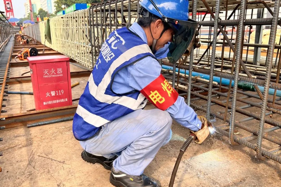 芳白城际项目电焊工正在焊接钢筋笼、