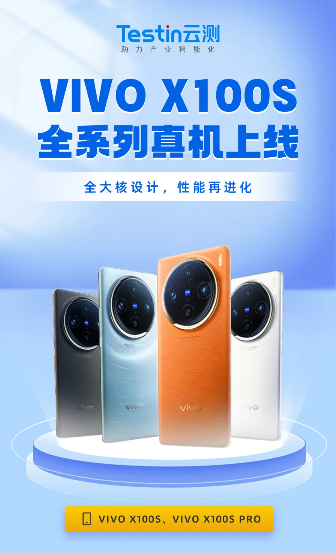 芯片:vivo X100s系列采用蓝晶x天玑9300+芯片,全球首发天玑9300+旗舰芯片,共同探索4+4全大核架构设计,八大赛道联合研发,搭载第七代AI处理器APU790,性能再获突破。系统:vivo X100s系列搭载了最新的OriginOS 4系统,内存融合4.0技术、全新智能助手“蓝心小V”,让用户的智能设备体验更加丰富多彩。相机:vivo X100s系列采用蔡司光学镜头,超感光仿生主摄、超视野超广角、蔡司超级长焦,精准捕捉色彩,让观感处处提升,卓越提升用户摄影体验。Testin云测已第一时间购买相关机型,并在国内首发vivo X100s、X100s Pro系列真机,确保应用在vivo X100s系列的卓越表现,为企业和开发者提供全面、高效、便捷的测试服务。