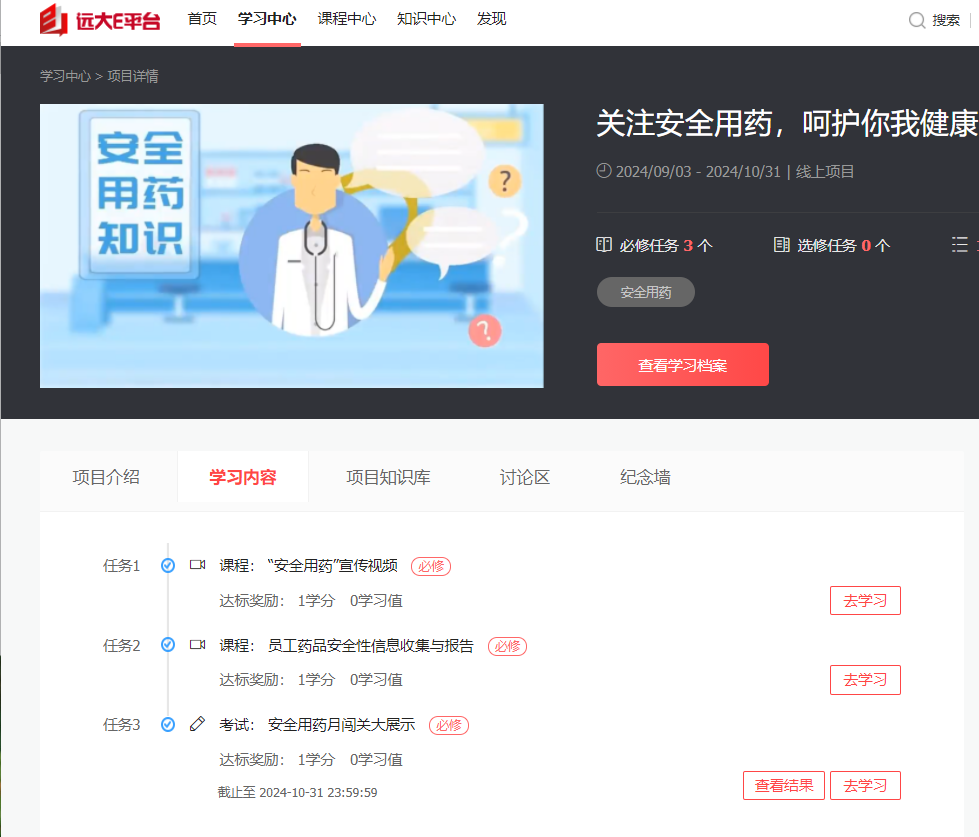 2024年09月01日,安全用药宣传视频和员工安全性信息收集与报告的培训在 “远大E平台”面向公司全员上线,内容包含安全用药知识、产品知识和GVP基础知识等,兼具普适性、趣味性、实用性。公司各部门活动参与率为100%,参与人数超1200人。
