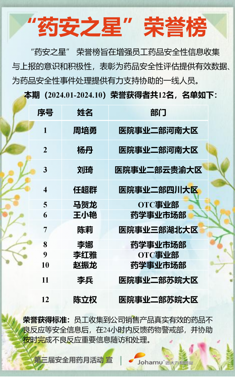 为增强员工对药品上市许可持有人药品安全主体责任承担的理念,提高员工对公司持有/代理药品的安全使用信息了解的深广度,提升安全用药意识,构建良好安全的研药、产药、销药、用药环境,2024年09月起,我公司开展了以“关注安全用药,呵护你我健康”为主题的“第三届安全用药月”活动。通过丰富的活动形式,展示了我公司对关注安全用药,呵护用户健康的重视。