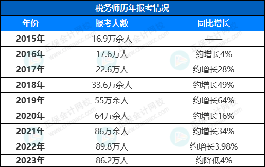 税务师报名人数自2016年开始,一直呈现非常大的涨幅,只有2023年略微降低,但报名人数总体还是稳定的。