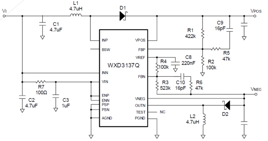 WXD3137Q在车载屏的灵活性和可靠性上具有明显优势,该芯片集成两路正负压电源,为显示Source芯片供电,同时还支持扩展外部两路电荷泵架构产生VGH/VGL电源,为显示Gate芯片供电。其支持输出电压、启动关断时序灵活配置,有效适配所有尺寸的车载LCD显示屏应用。