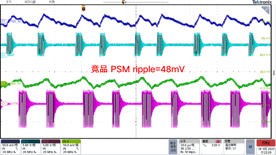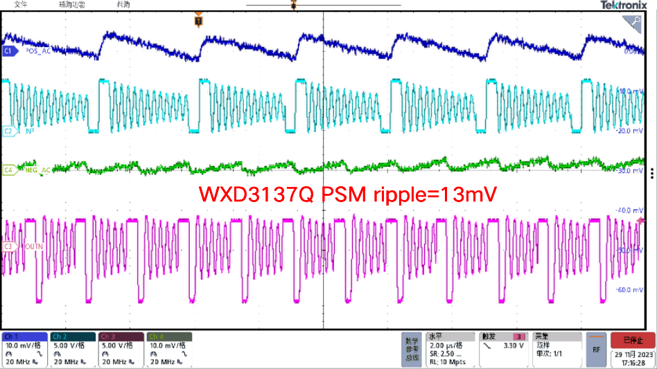 在轻载高效模式下,WXD3137Q的纹波约为13mV,与同测试条件下竞品48mV的纹波要小不少,所以WXD3137Q可以提供更稳定的电源输出。