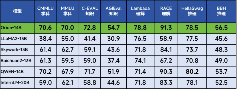 猎户星空于今年年初发布“为企业应用而生”的大模型(Orion-14B),也是猎户星空继 2016 年 All in AI 后的最新成果。该模型以其140亿的参数规模,展现出卓越的性能,不仅在百亿参数大模型基座能力上行业领先,于MMLU、C-Eval、CMMLU、GAOKAO、BBH等第三方测试集上,均展现出同级别模型中的最高水平(SOTA),且在结合企业私有数据和应用时,可以实现千亿参数级别的模型效果。